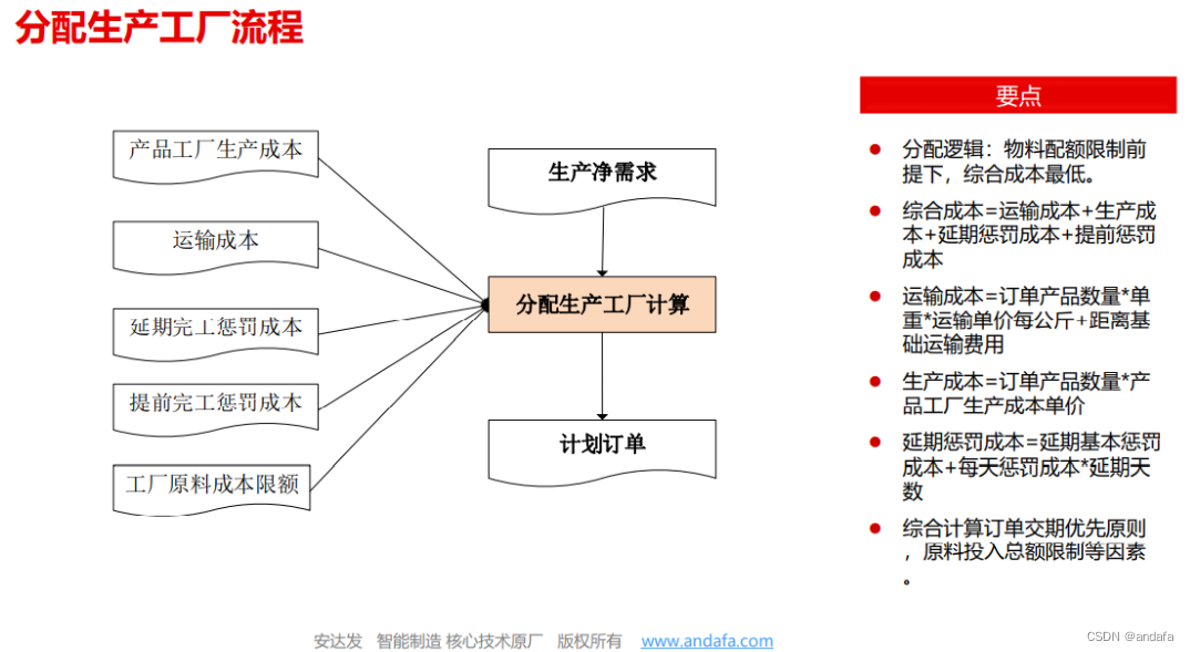 - 分配生产工厂:综合考虑不同工厂的运输成本、生产成本、工厂生产能力、提前交货惩罚成本、延期交货惩罚成本 、工厂最大在手物料金额限额、等多种因素,将生产净需求分配到综合成本最低的工厂生产,实现订单综合利润最大化。