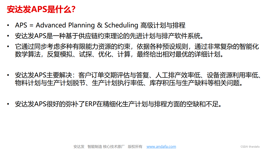 APS排程软件通过预先设定好相关基本资料与约束规则,自动考虑各种影响生产计划的因素,应用各类预设规则,最后给出最优化的计划方案,当订单、机台、工具、材料、上下班时间等任何影响生产计划的因素变化后,执行“一键式排程计算”,系统即可生成生产详细排程,也可选择不同的排产方案,可以实现不同的排程效果,也是设置无人值守的自动定时排程。