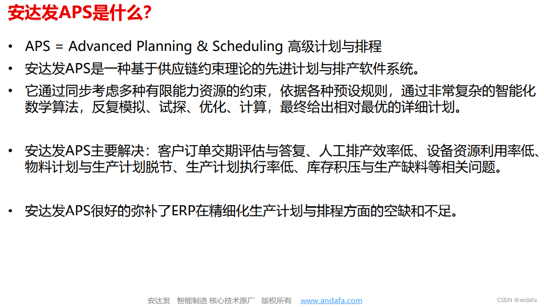 APS高级排程通过销售预测、物流运输计划、生产需求计划、智能优化排产、高级物料需求计划、供应商交货计划为企业提供供应链全流程计划与排产解决方案,实现交货需求、生产计划、采购计划、自制件、外购件的拉动式协同供应,从而显着减少交期延误、库存积压、与生产欠料等重大问题。