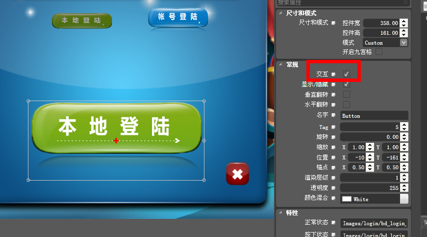 cocostudio编辑器,编辑的UI界面的时候,如果你添加的按钮支持点击效果,必须在编辑器中设置该按钮为交互状态,否则,加载到游戏中,点不中!