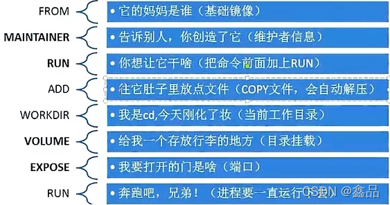 基础镜像信息、 维护者信息、 镜像操作指令和容器启动时执行指令。