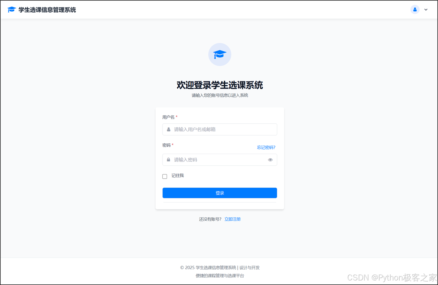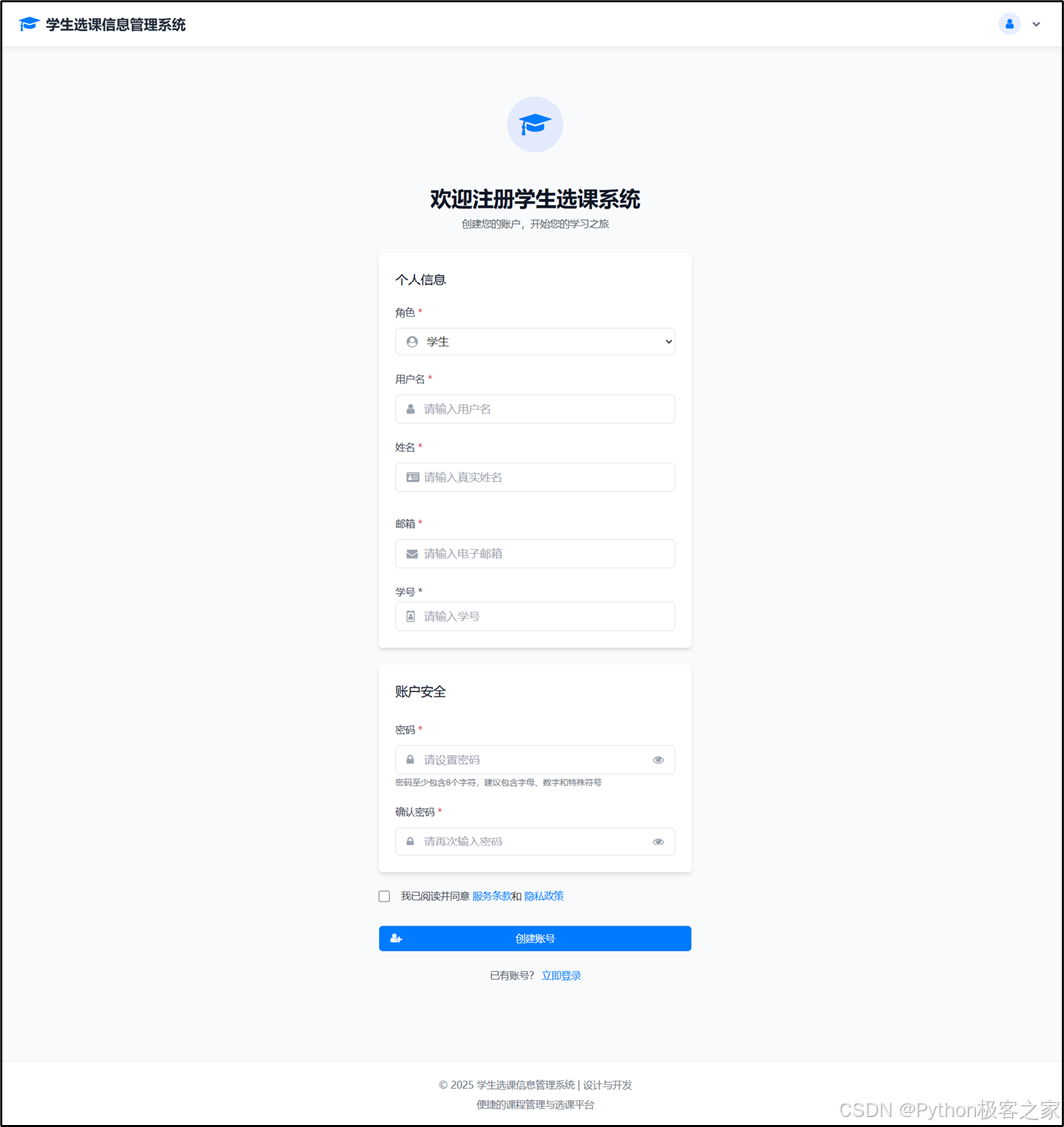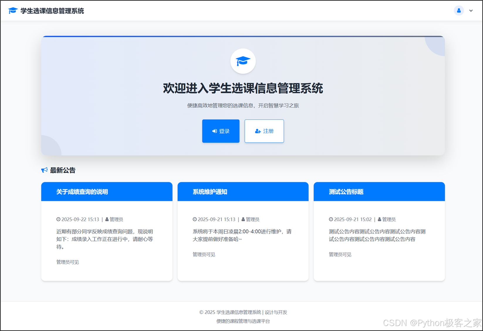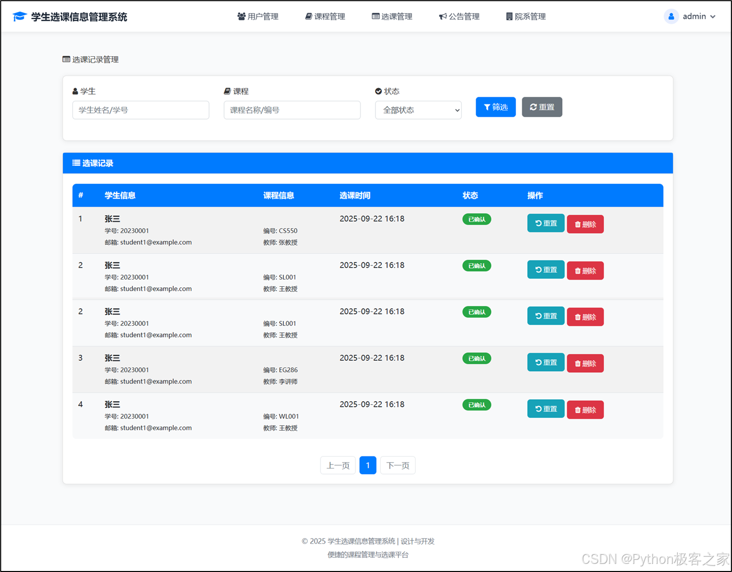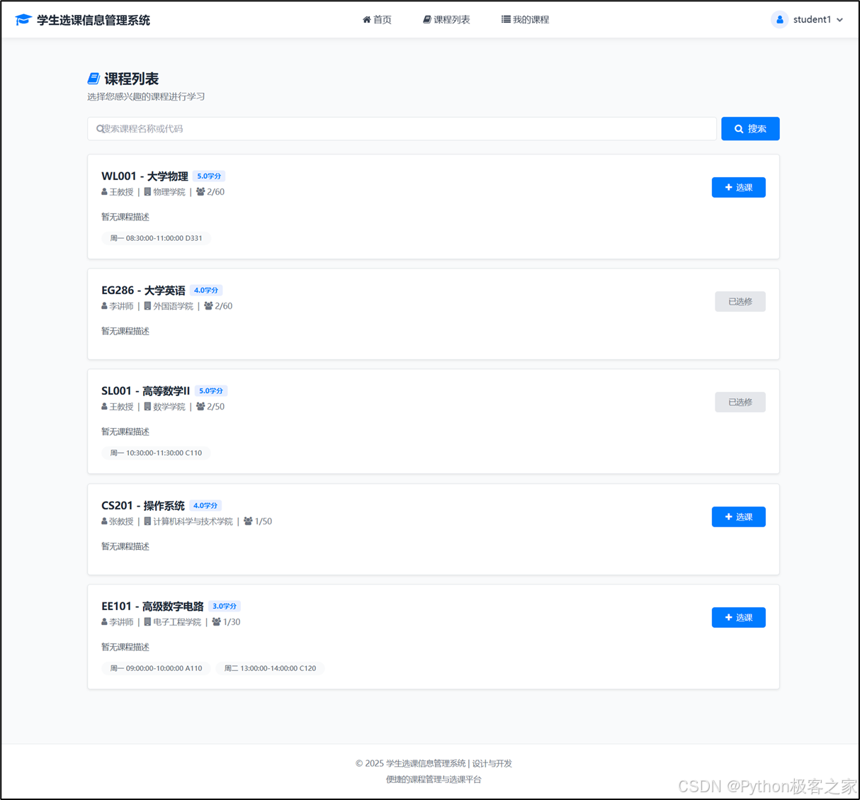 在现代教育体系中,学生选课管理是学校教务管理的重要组成部分。传统的选课系统通常依赖于纸质表格或简单的电子表格,这种方式不仅效率低下,而且容易出错。随着信息技术的发展,利用编程语言和数据库技术开发高效、可靠的选课系统已成为可能。本项目旨在开发一个基于Python的学生选课信息管理系统,利用现代化的Web应用框架和数据库技术实现高效的学生选课管理。