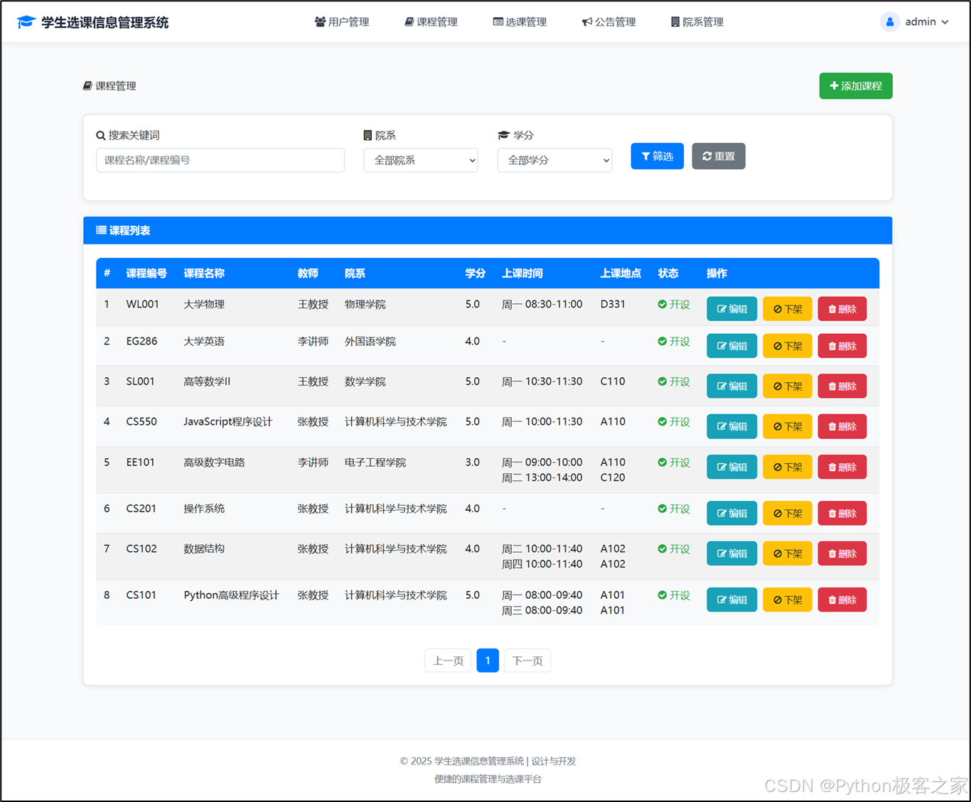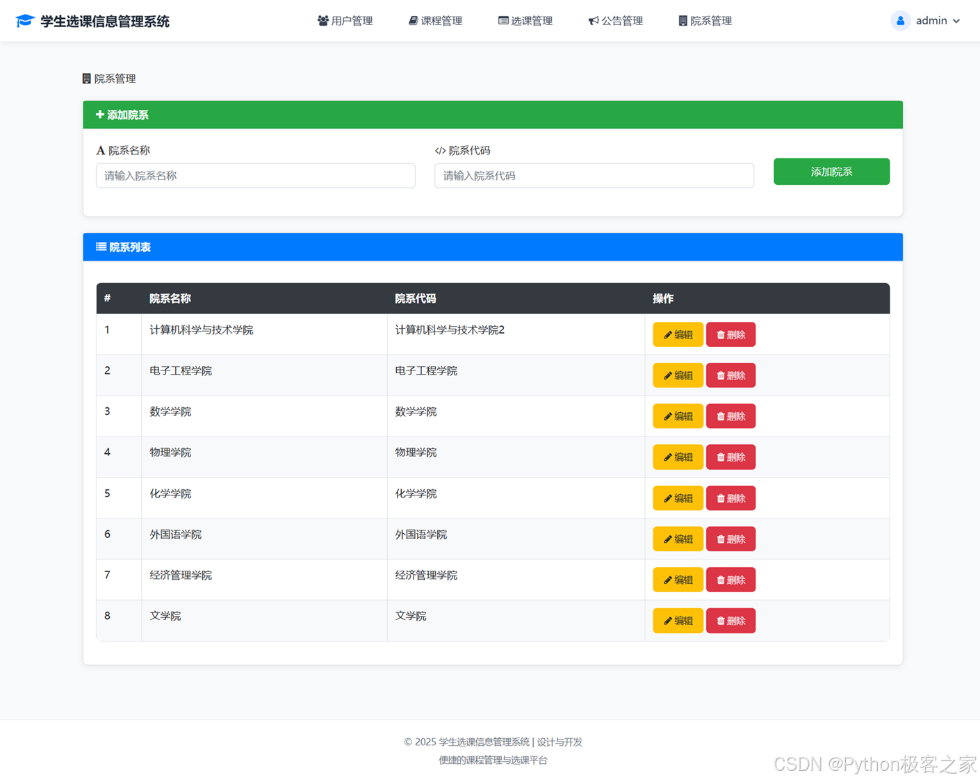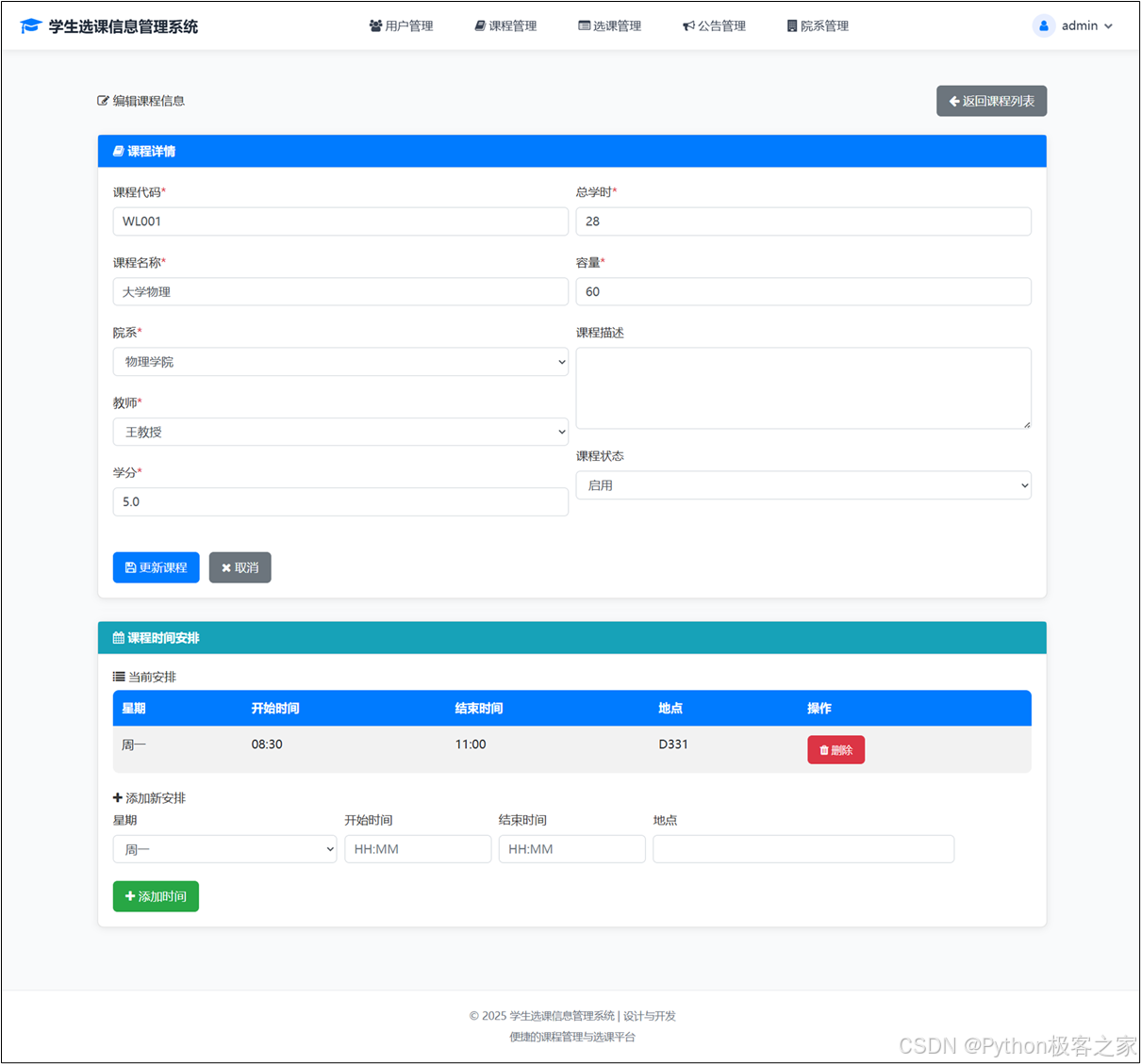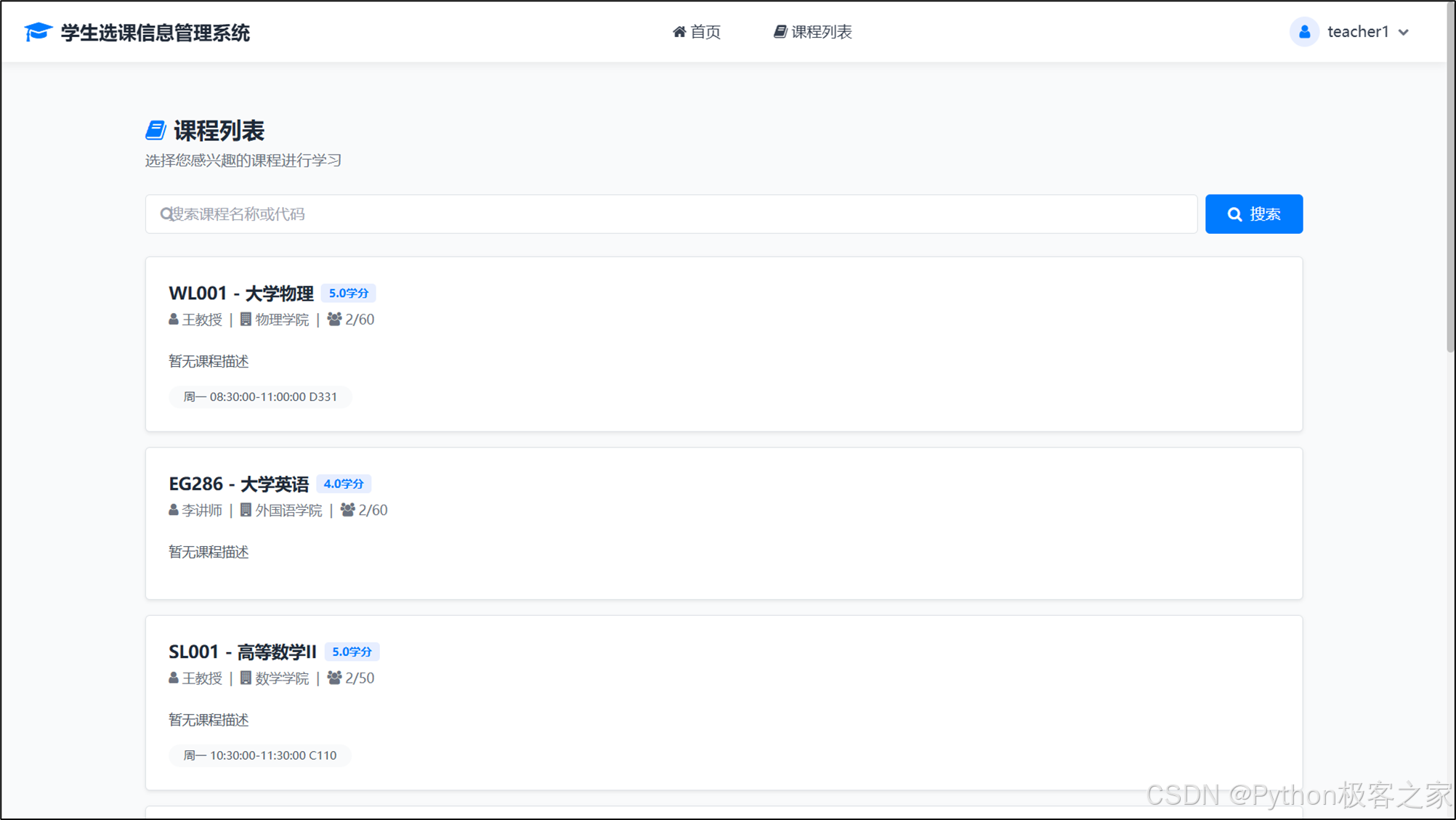 在现代教育体系中,学生选课管理是学校教务管理的重要组成部分。传统的选课系统通常依赖于纸质表格或简单的电子表格,这种方式不仅效率低下,而且容易出错。随着信息技术的发展,利用编程语言和数据库技术开发高效、可靠的选课系统已成为可能。本项目旨在开发一个基于Python的学生选课信息管理系统,利用现代化的Web应用框架和数据库技术实现高效的学生选课管理。