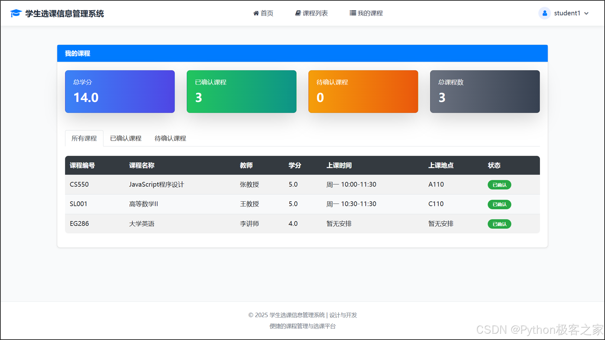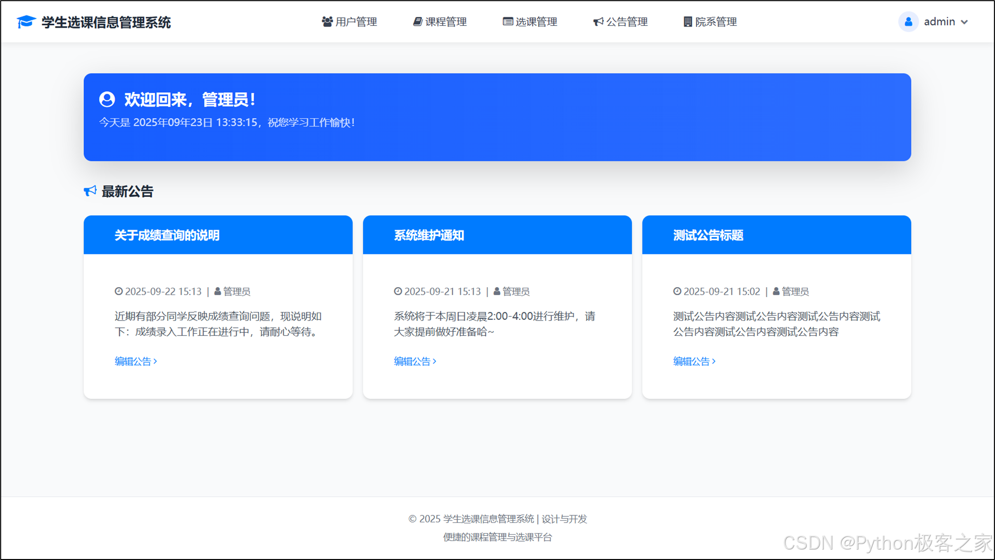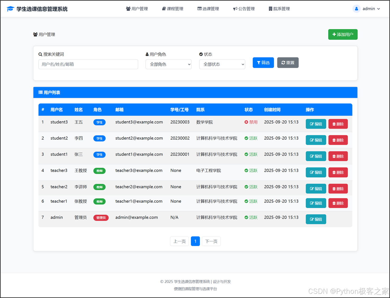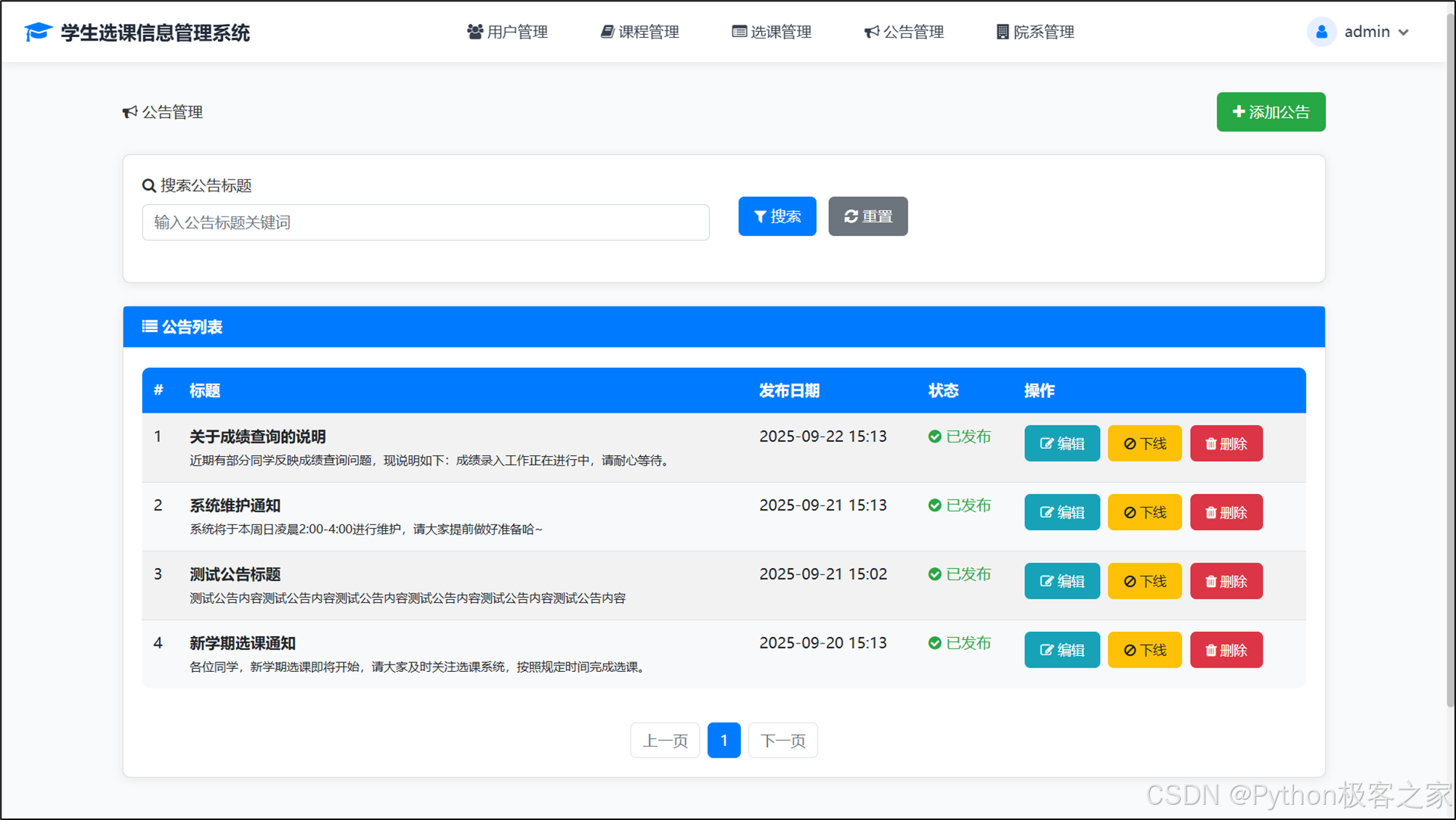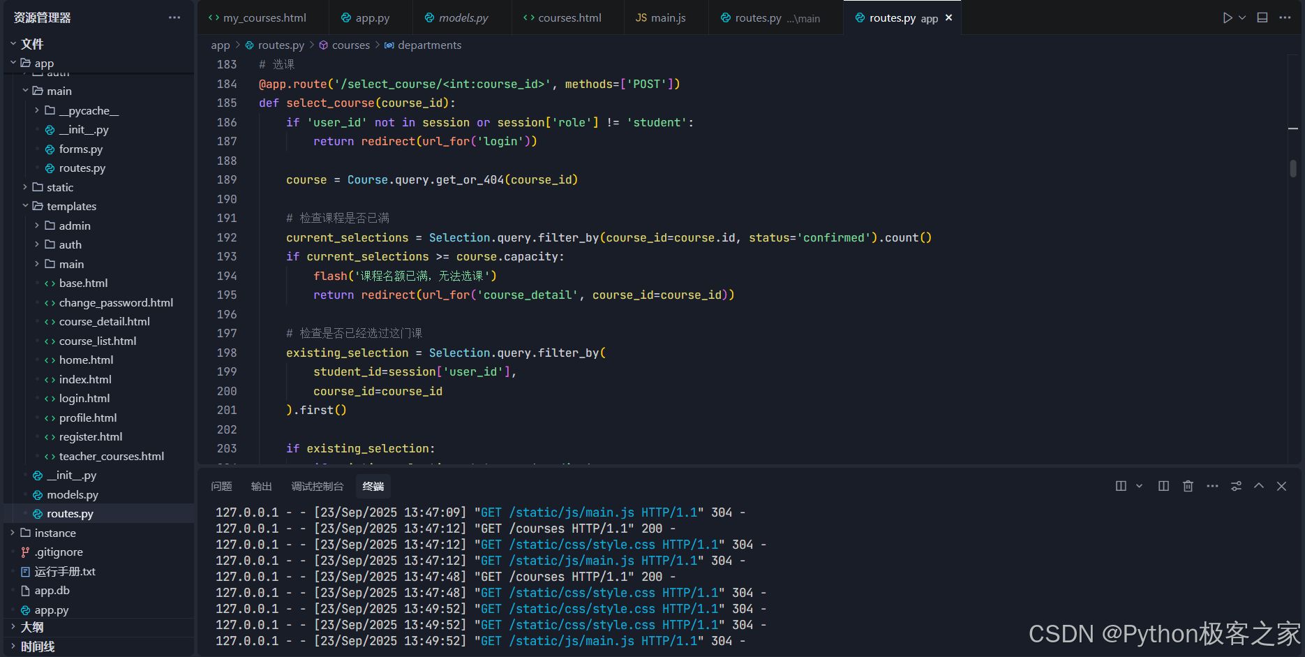 在现代教育体系中,学生选课管理是学校教务管理的重要组成部分。传统的选课系统通常依赖于纸质表格或简单的电子表格,这种方式不仅效率低下,而且容易出错。随着信息技术的发展,利用编程语言和数据库技术开发高效、可靠的选课系统已成为可能。本项目旨在开发一个基于Python的学生选课信息管理系统,利用现代化的Web应用框架和数据库技术实现高效的学生选课管理。
