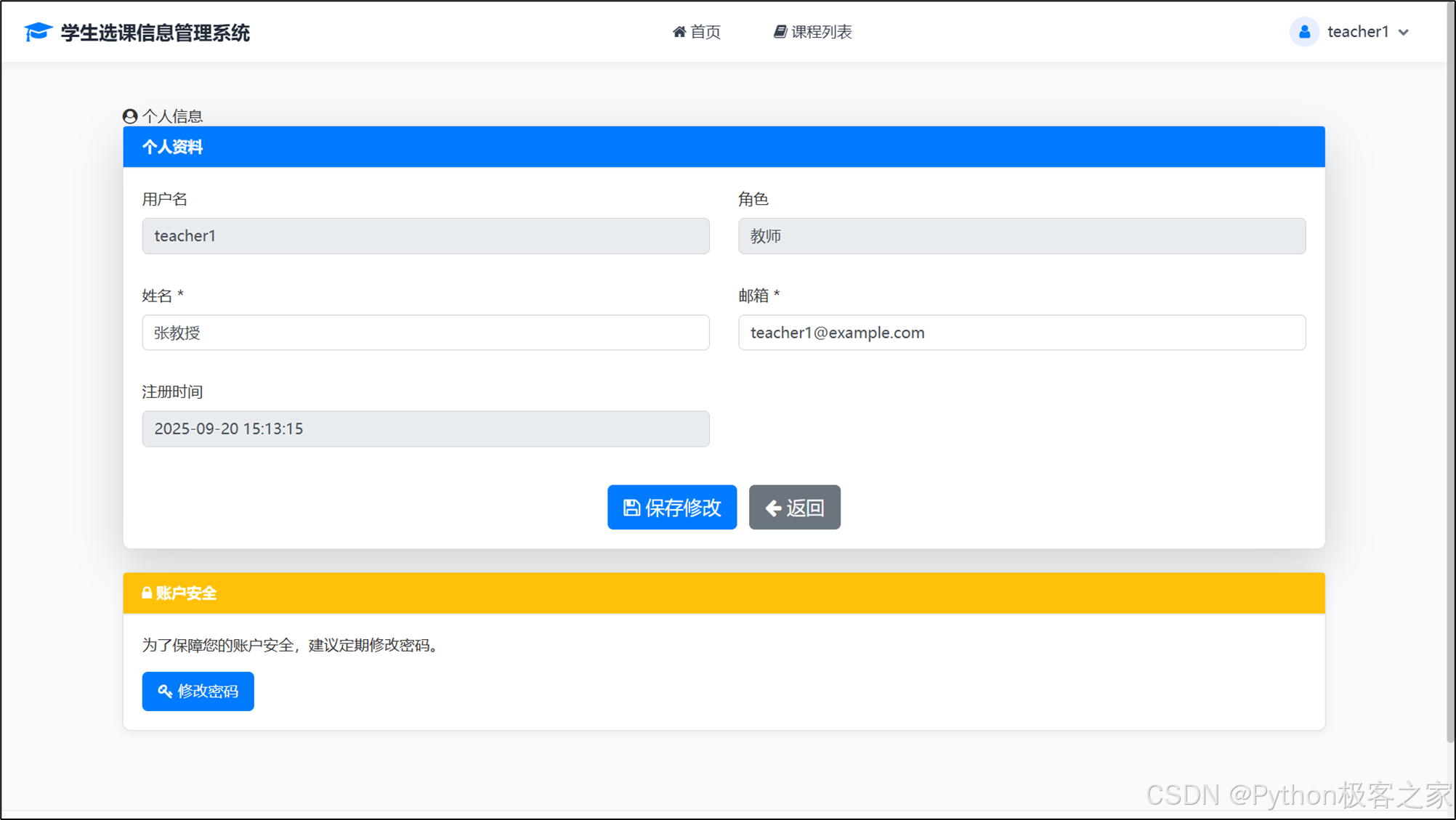 - 一对多:一个教师可以教授多门课程(通过Course.teacher_id关联)