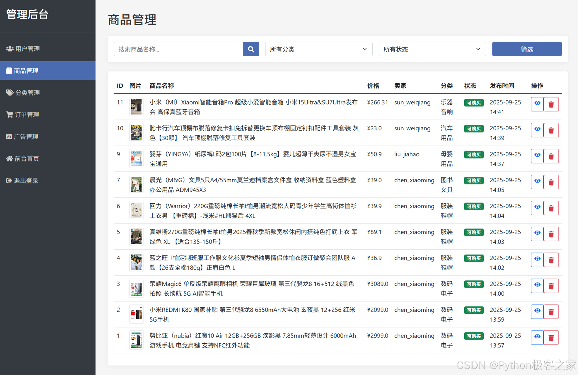 支持商品信息查看、搜索、筛选及编辑删除,实现高效的商品审核与管理。