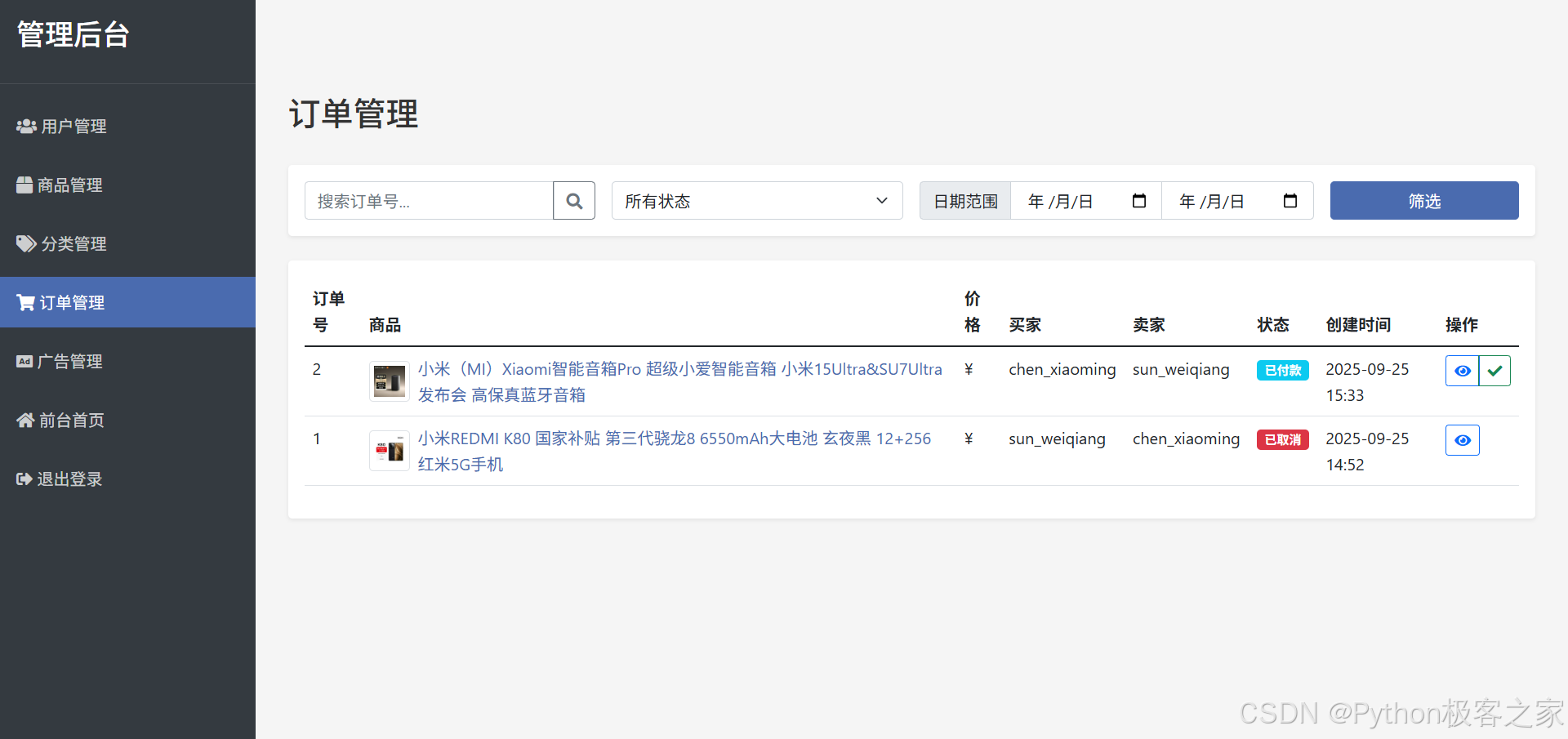 展示用户订单列表,包含订单号、商品信息、价格、状态及操作选项,支持查看详情。