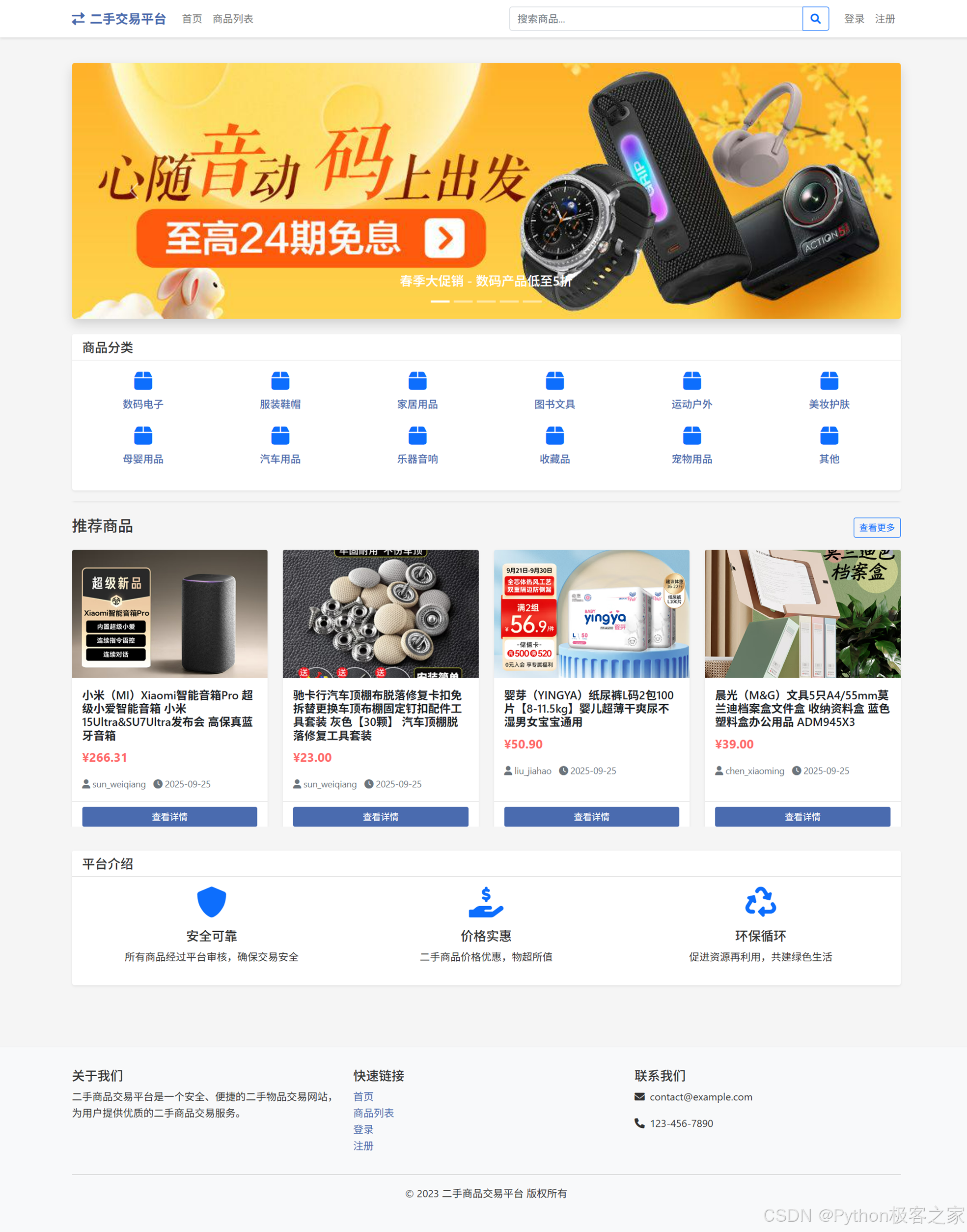 首页包含商品分类、推荐商品、平台介绍及快捷导航,支持搜索与浏览,提供安全、实惠、环保的二手交易服务。