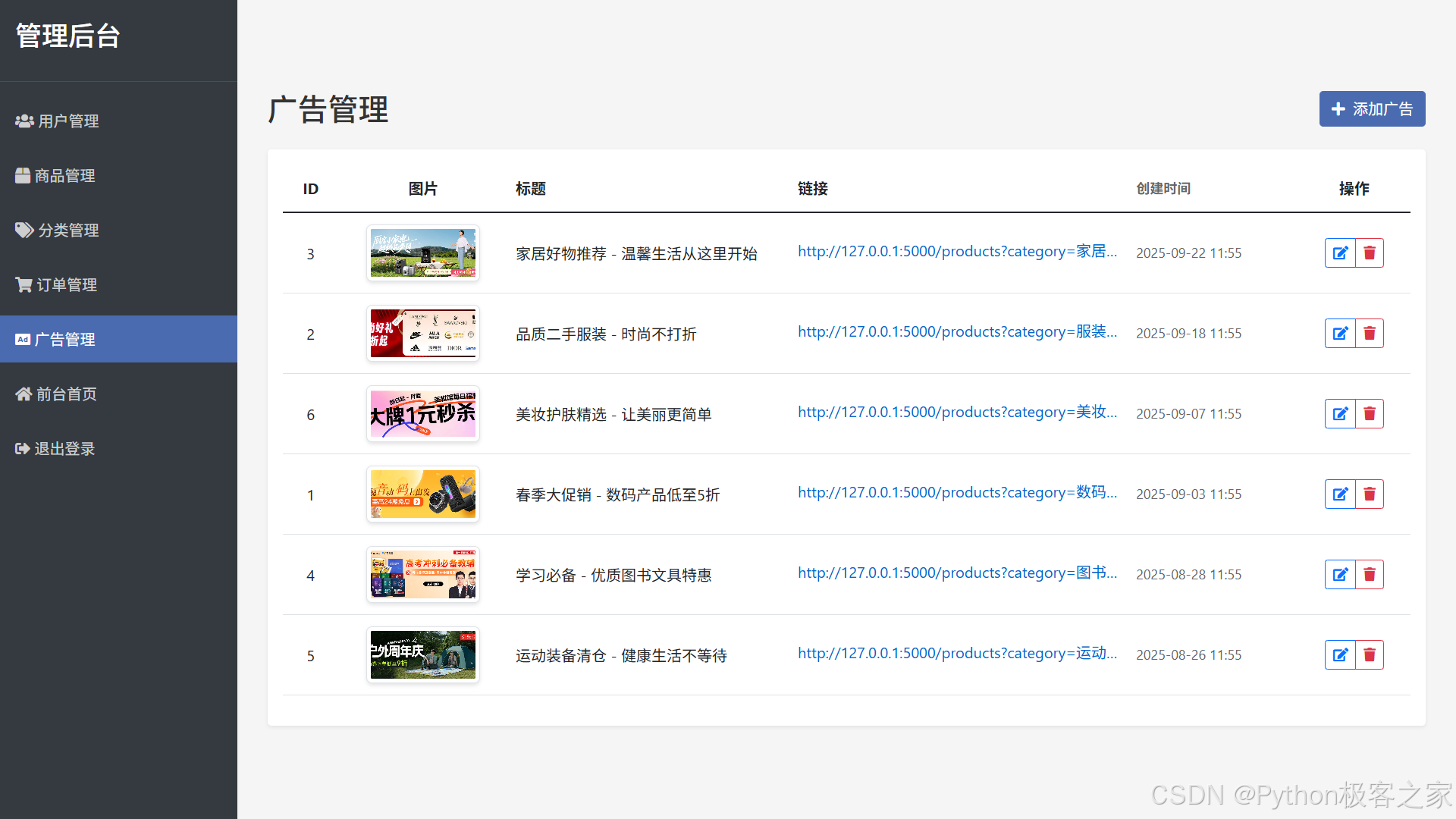 支持广告的添加、编辑、删除,管理首页展示内容与推广信息。