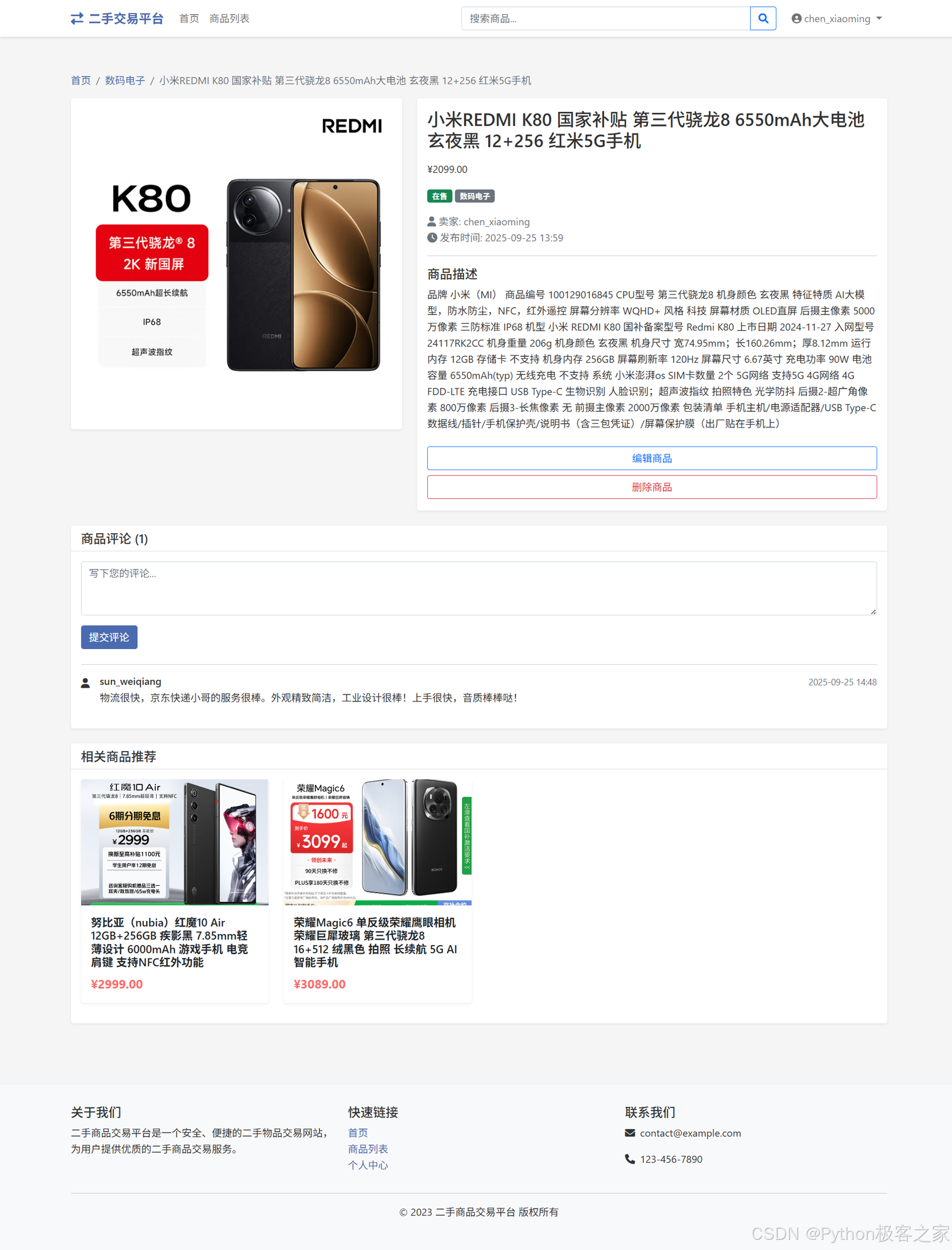 商品详情页展示商品信息、用户评价,支持评论互动与相关商品推荐,便于用户全面了解并决策购买。