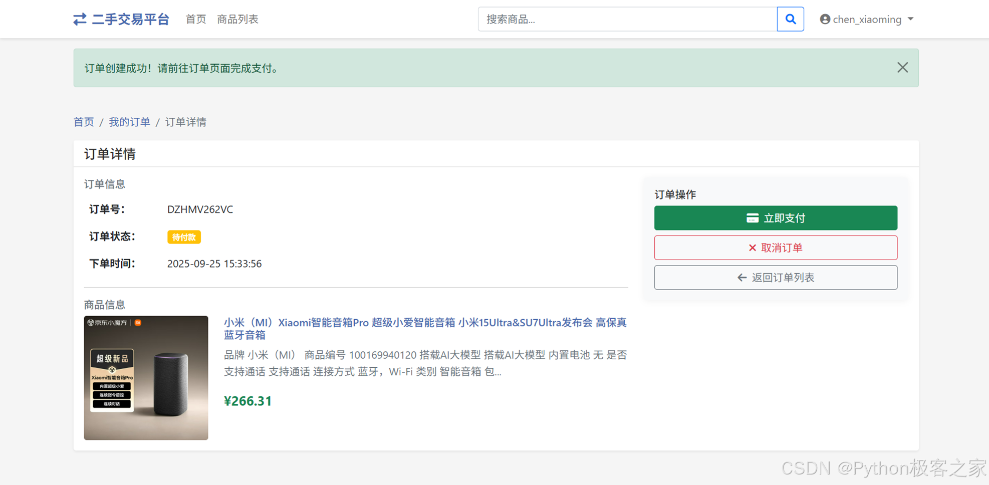 展示订单详情,支持立即支付或取消订单,确保交易流程清晰便捷。