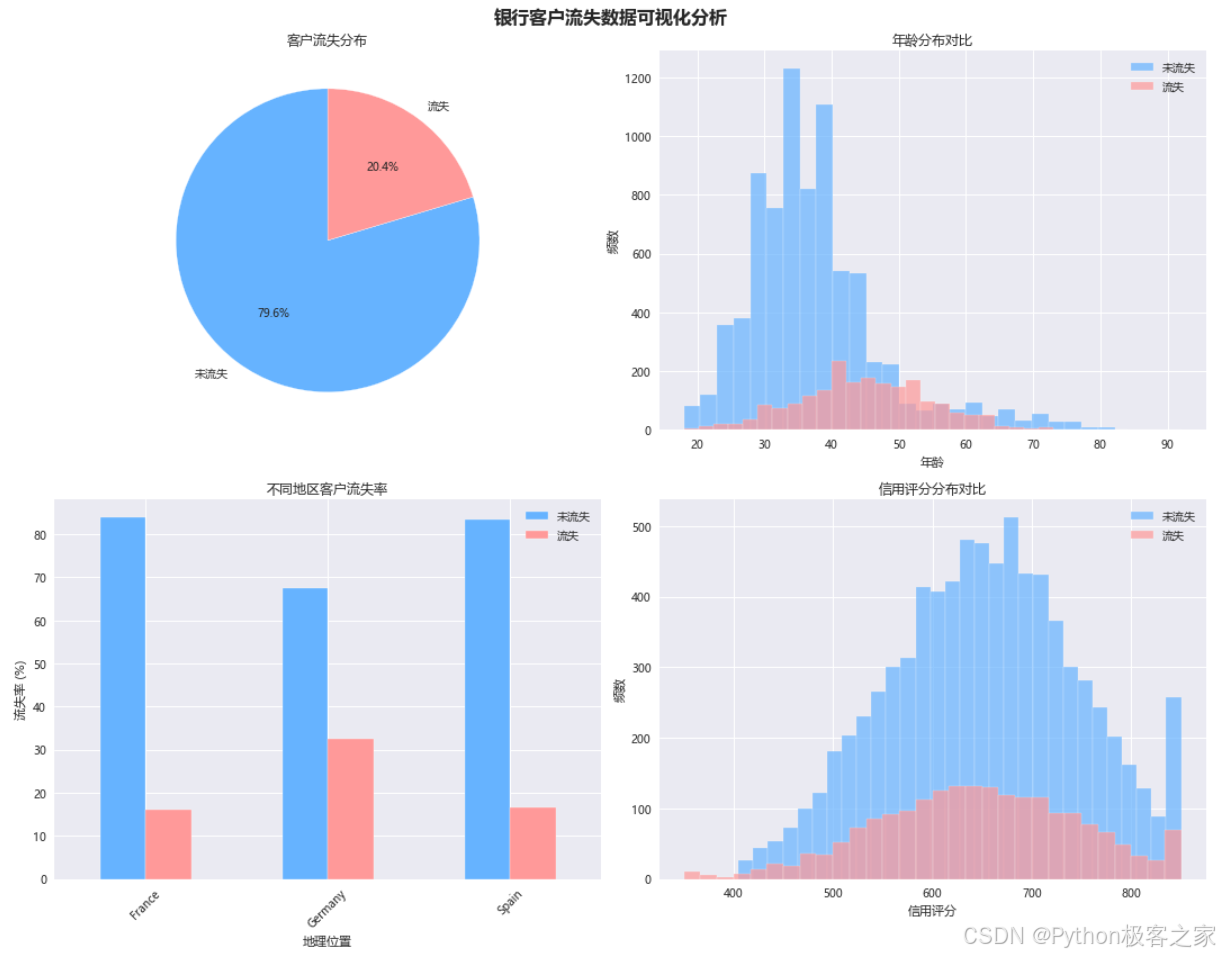 3.3.1 客户流失分布、年龄分布、地理位置与流失关系、信用评分