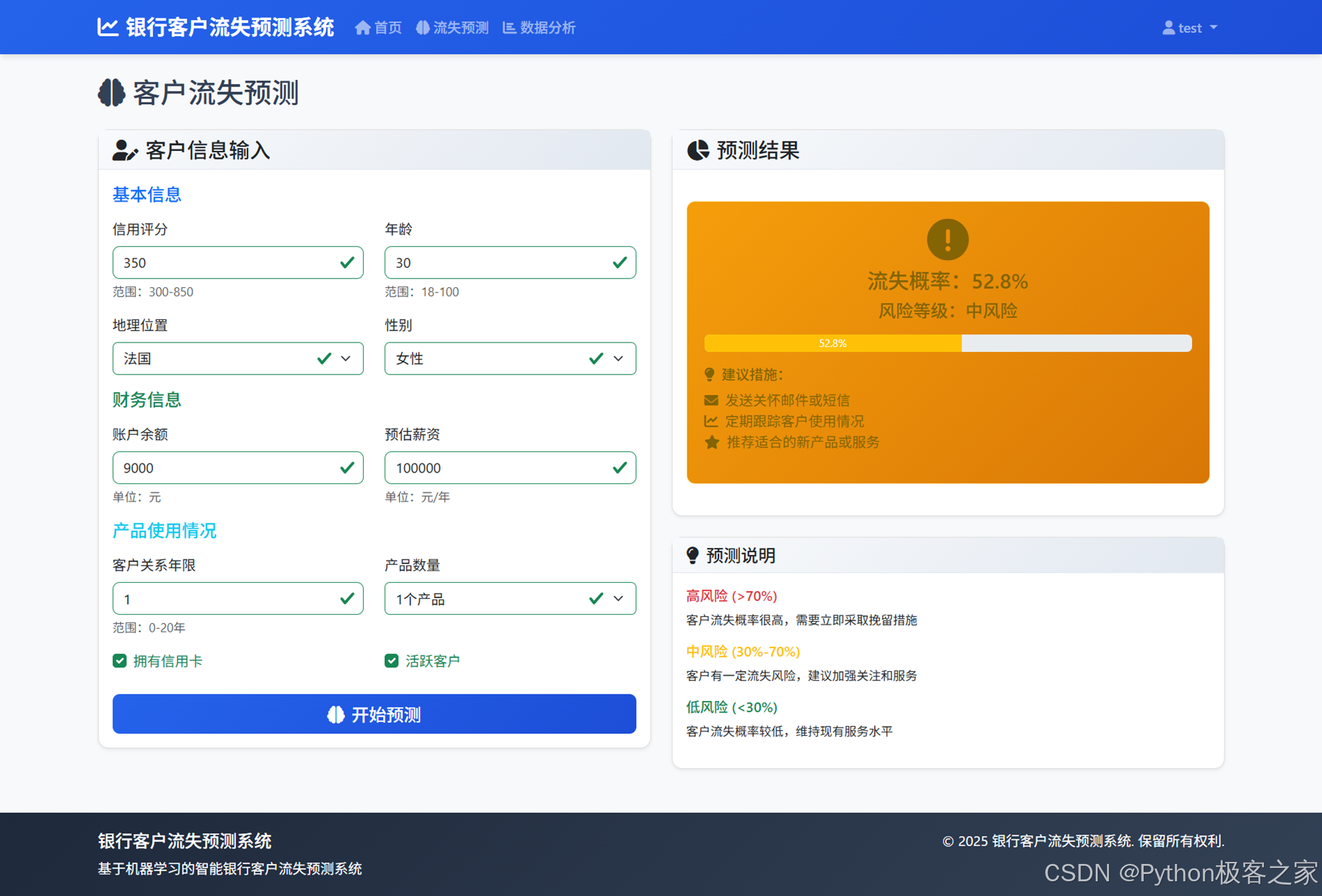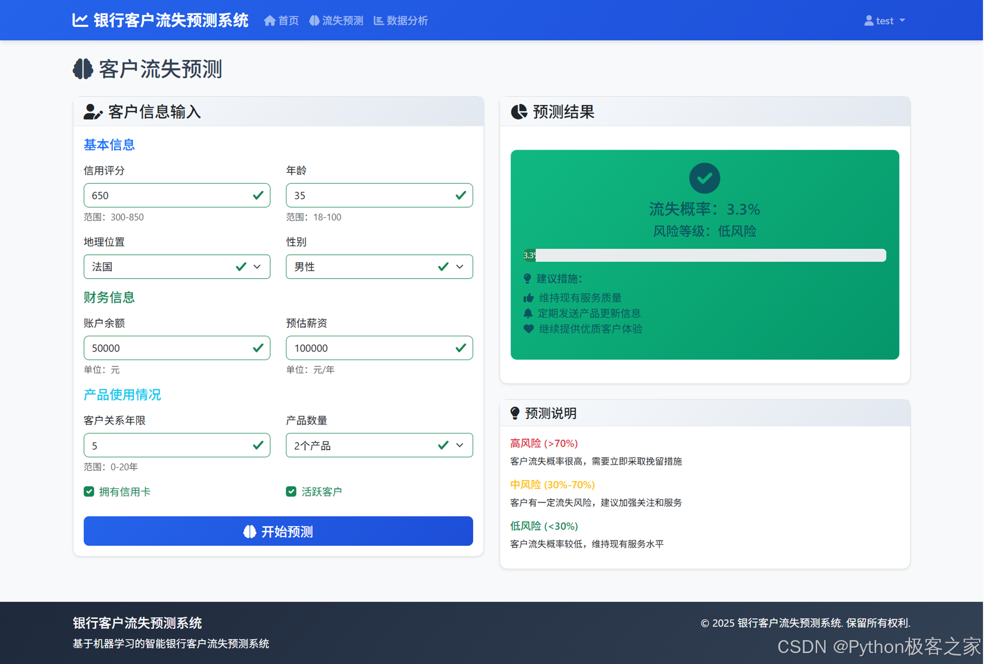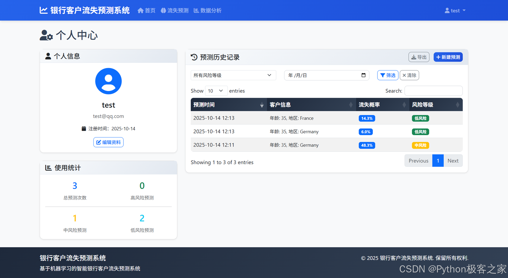 随着金融服务市场的日益饱和以及金融科技公司的崛起,银行面临着前所未有的客户流失挑战。基于机器学习的银行客户流失预测分析系统旨在通过深入分析客户数据,识别出可能流失的高风险客户群体,并为银行提供针对性的挽留策略建议。系统采用Flask后端、Bootstrap前端,结合SQLite数据库存储数据。关键技术包括数据预处理(缺失值检测、特征编码)、多种机器学习模型(随机森林、XGBoost等)训练与评估,以及可视化分析(客户分布、特征相关性等)。系统功能涵盖用户管理、多维数据分析及流失预测,帮助银行制定精准挽留策略,提升客户留存率。