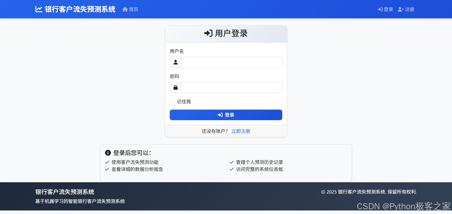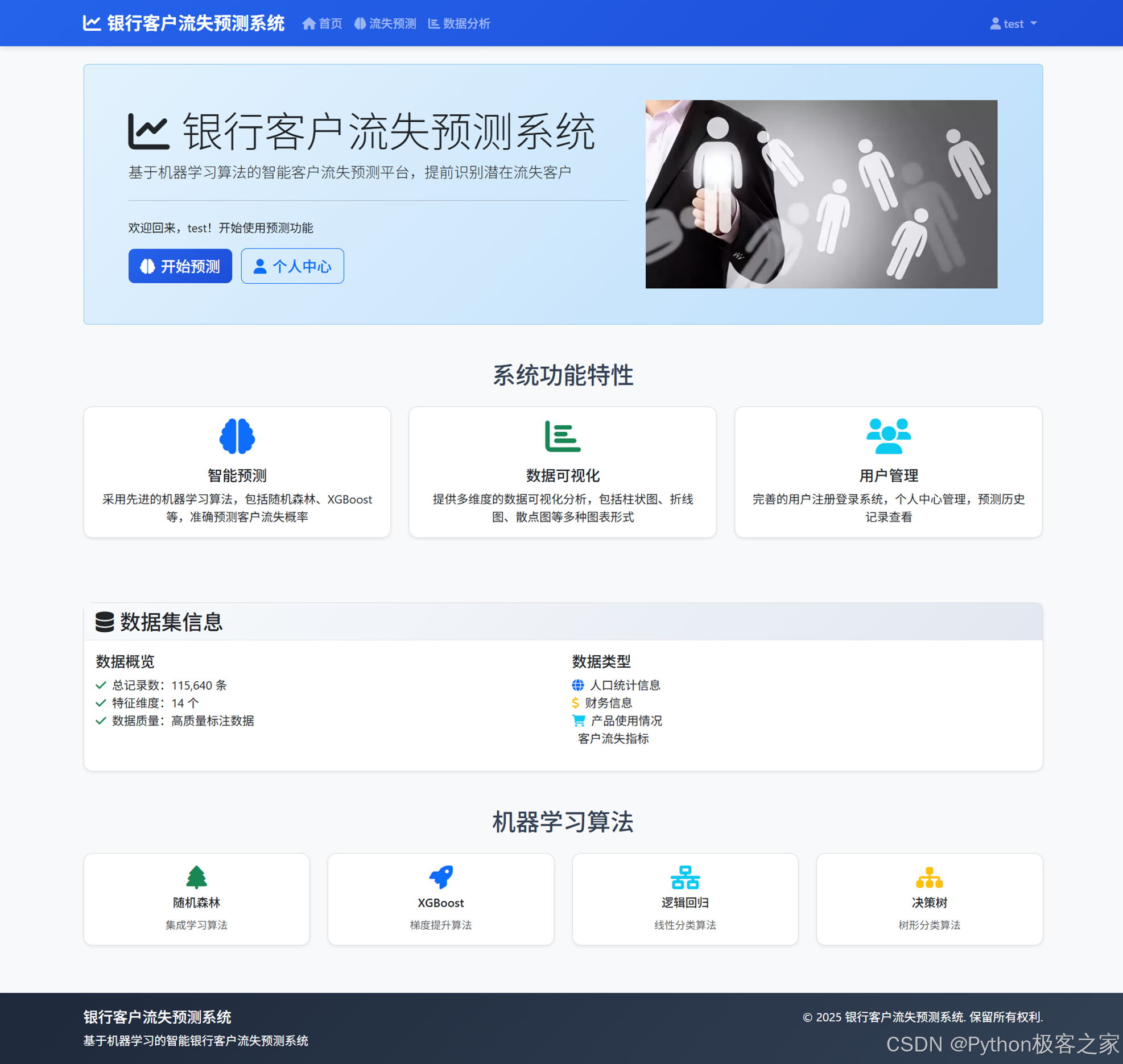 本项目基于机器学习构建银行客户流失预测系统,通过分析客户数据识别高风险流失客户。系统采用Flask后端、Bootstrap前端,结合SQLite数据库存储数据。关键技术包括数据预处理(缺失值检测、特征编码)、多种机器学习模型(随机森林、XGBoost等)训练与评估,以及可视化分析(客户分布、特征相关性等)。系统功能涵盖用户管理、多维数据分析及流失预测,帮助银行制定精准挽留策略,提升客户留存率。