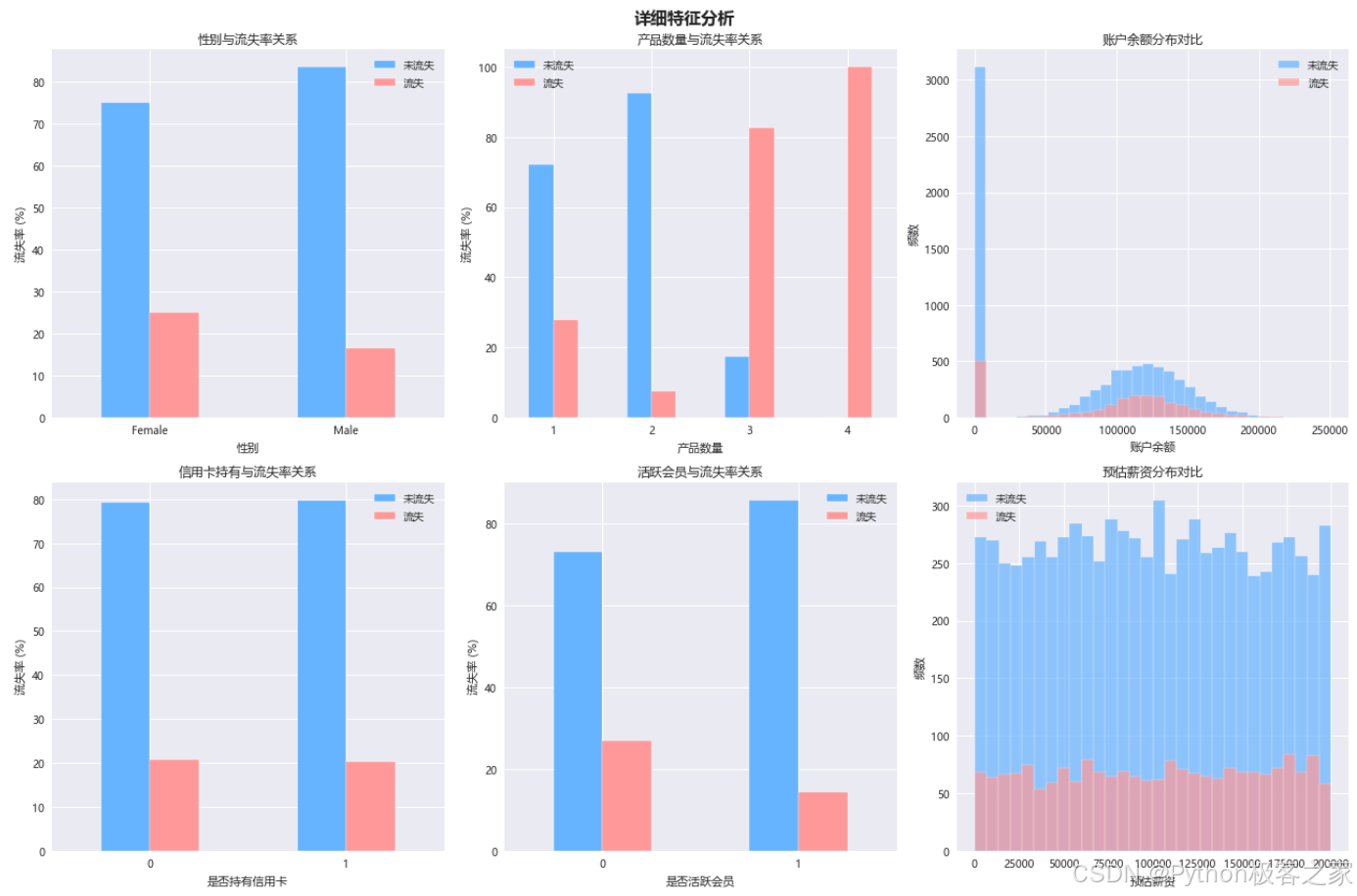 3.3.3 性别与流失、产品数量与流失、账户余额分布、是否持有信用卡与流失、是否活跃会员与流失、预估薪资分布