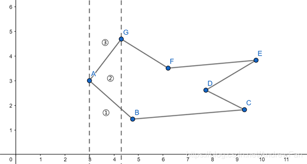 所谓的从左到右不难理解,图中的每个顶点都被从左至右排序,而通过这些顶点的垂线将平面划分成了若干区域,这些被划分的区域我们可以称为不同的扫描阶段,因此以上共有A、G、B、F、D、C、E七个阶段。
