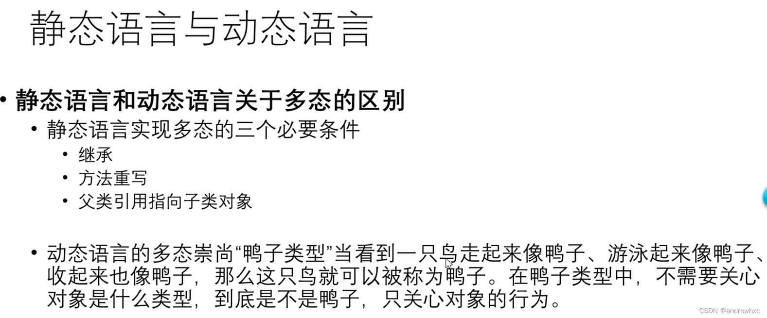 简言之:静态语言要实现多态,必须明确继承关系,然后才可以使用;但是动态语言只关心是否具有这个方法,不需要考虑类型