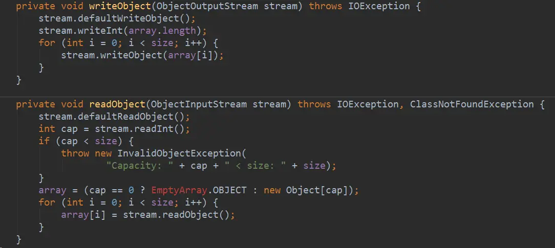 ArrayList内部实现了writeObject和readObject方法,通过这两个方法自己控制序列化过程。