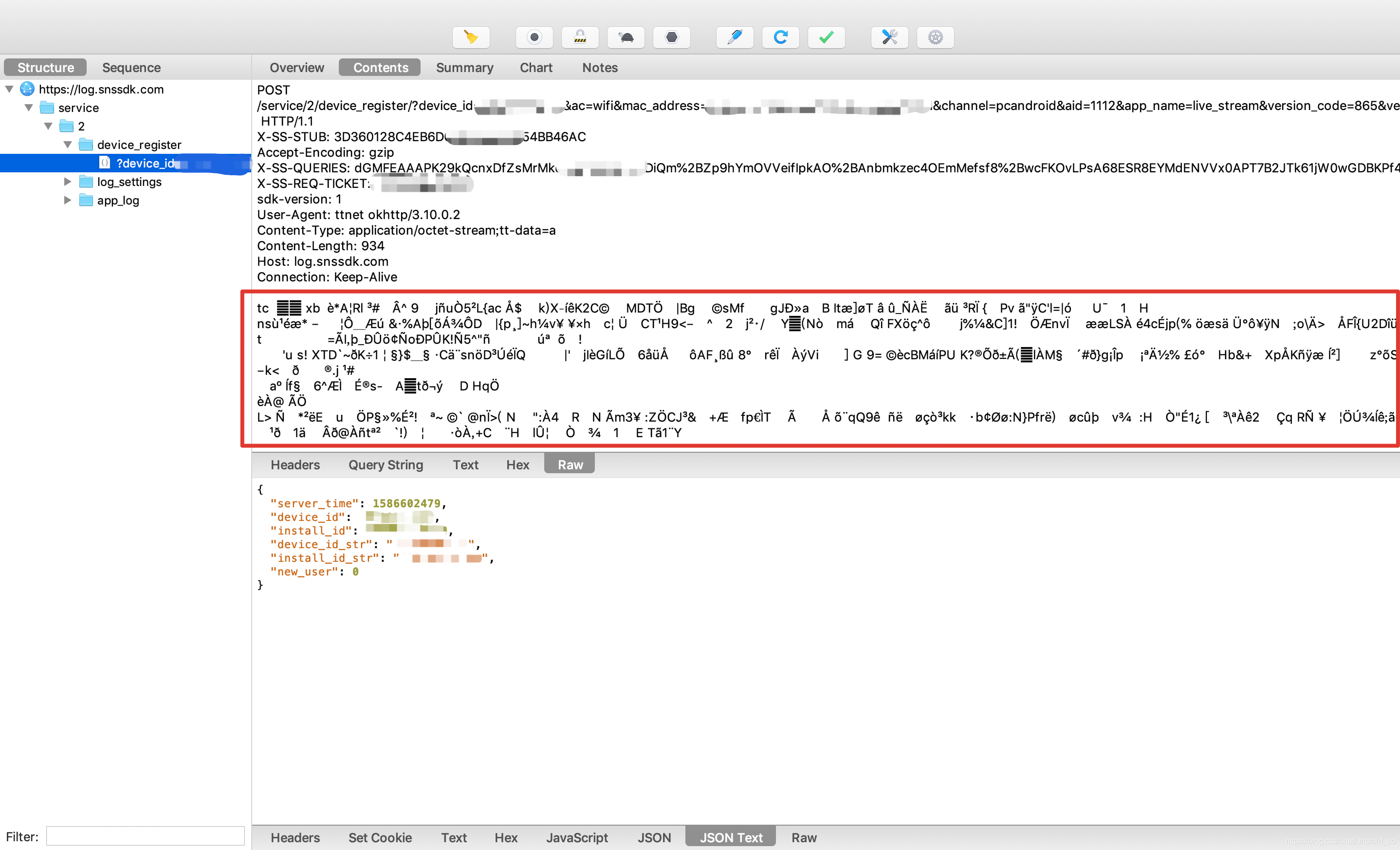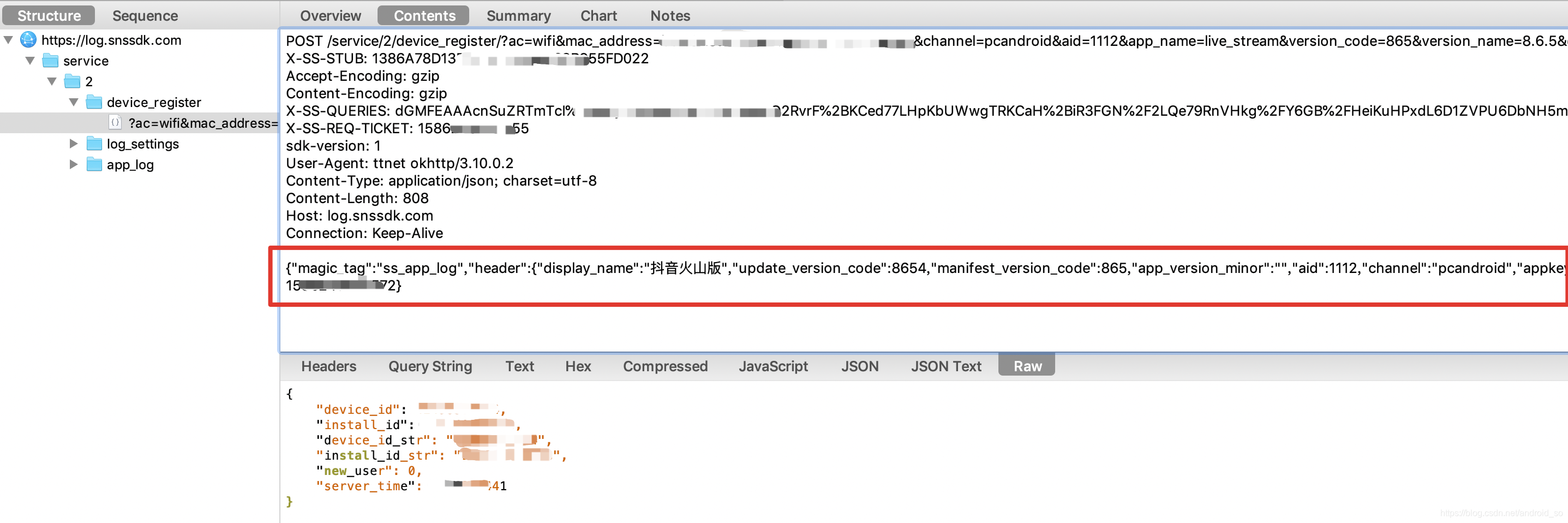 上文也提到了,本文主要是研究这个接口:https://log.snssdk.com/service/2/device_register/ ,正常情况下设备在注册的时候会加密访问这个接口,比如新安装了app或者app被清理数据之后,再打开app时就会去访问这个接口,访问时是个POST请求,参数是明文,但是带的data是加密的,如下图所示: