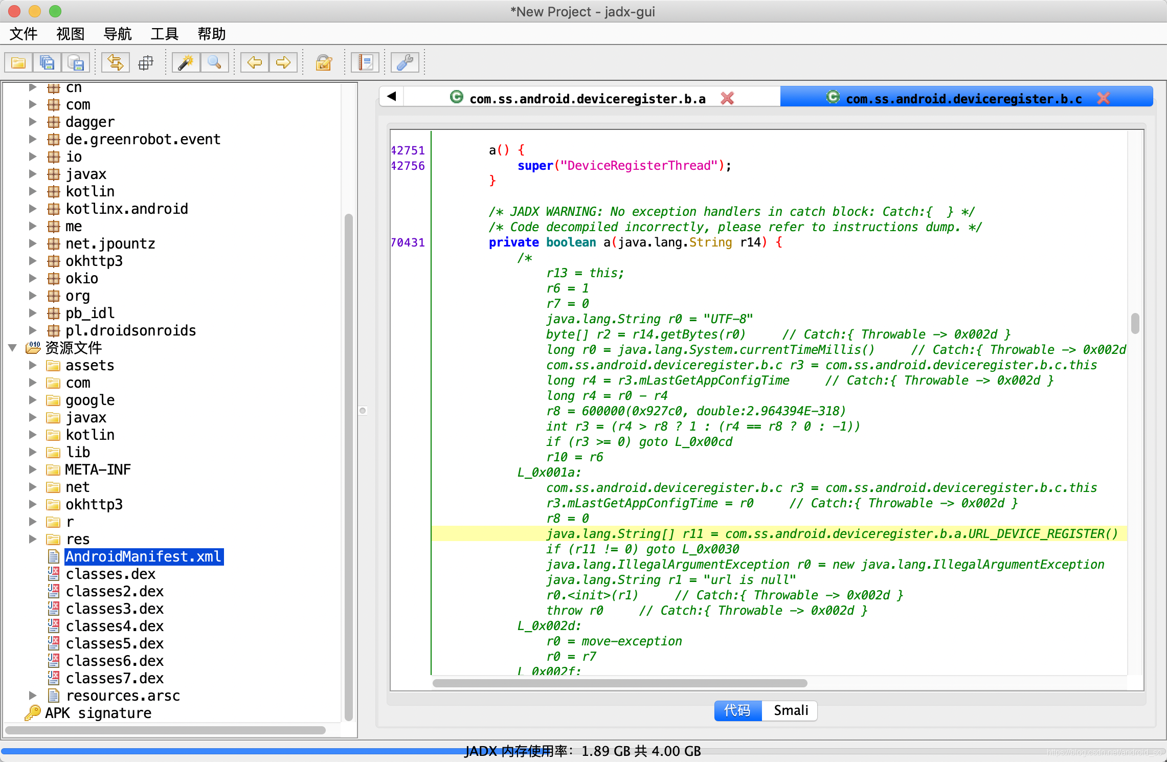可以看到有个DeviceRegisterThread字符串映入眼帘,然后就能大概知道这个类比较重要了,上面能看到它继承的Thread类,那么这就应该是设备注册请求网络部分的子线程了。唉,其实一开始笔者找到别的地方去了,一开始专注于分析这个device_id所在的本地缓存了,因为本地有缓存的时候会优先加载本地缓存而不是发起这个网络请求,后来发现分析完了本地缓存之后并没有什么用,不过倒是把附近的几个类整明白了一点。扯远了,下面还是继续分析这个继承自Thread类的com.ss.android.deviceregister.b.c.a类吧,这个类其实可以从头分析,这里不再详细说了,先把jadx正常反编译的部分仔细过一遍,然后就能发现上图那个反编译失败的函数很重要,应该就是发起网络请求相关的部分。但是jadx反编译失败了,而且这个伪码看起来也不适合分析,那么就想着看smail代码呗,但是发现竟然找不到这个类对应的smail代码,只能说是jadx的bug了吧。那怎么办?这时候JEB就可以出场了。