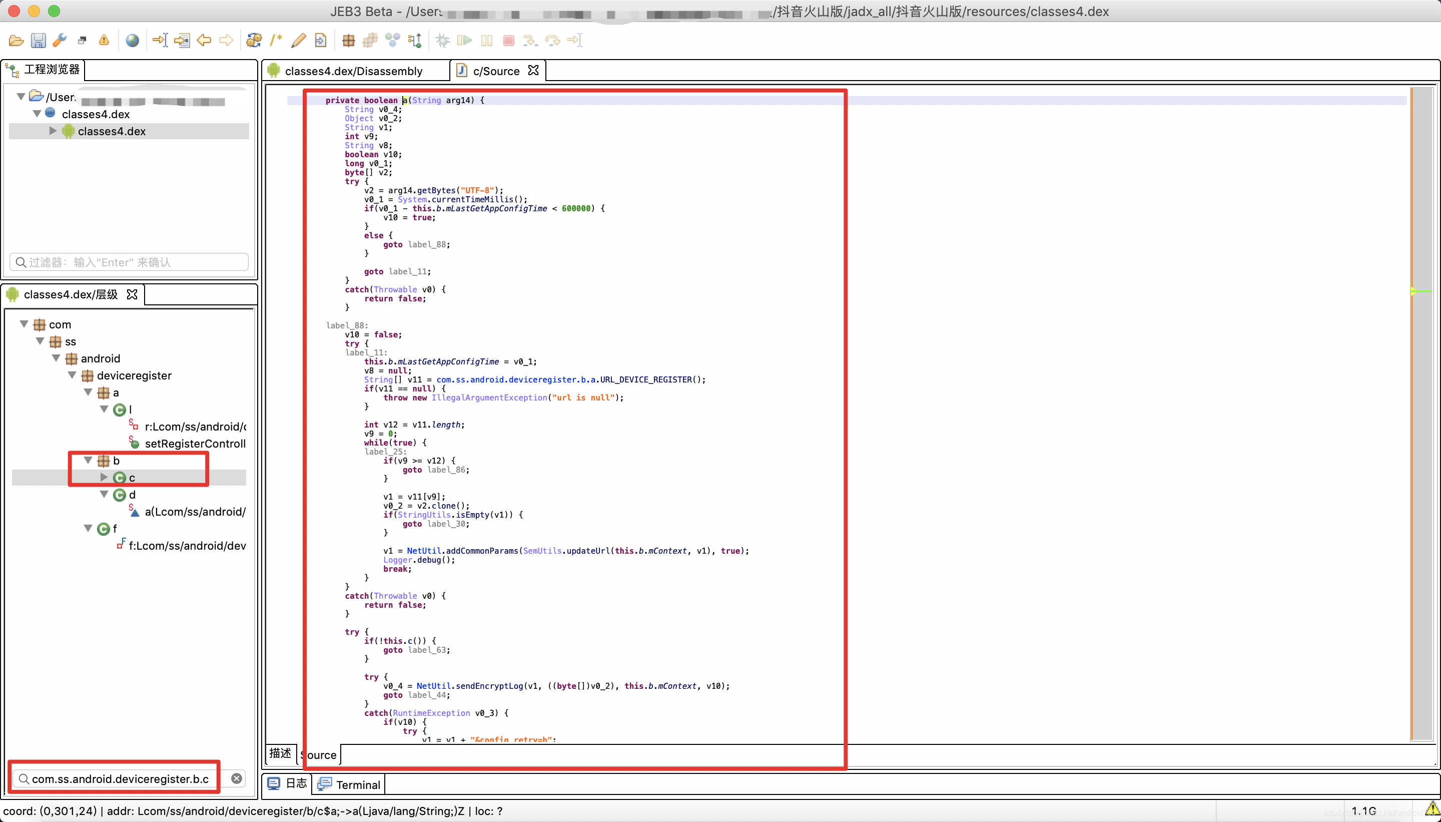 笔者之前用的是JEB2,这次搞这个的时候搜了一下这个工具发现JEB3也出来了,上面提到的JEB超链接给的就是一个JEB3的地址,虽然好像是个beta版本,但是也不影响使用。之前用JEB2的时候就遇到过一个问题,那就是直接打开一个apk安装包的时候,特别是体积比较大的安装包的时候会提示内存溢出而无法打开的情况,解决方法是找到想要具体分析的dex文件,然后只打开该dex文件分析即可。所以这次笔者也是先找到了上面要分析的代码所在的dex文件,然后单独分析该dex文件即可。那么问题来了,怎么找到代码所在的dex文件呢?这时候想到jadx反编译的时候好像在shell上面输出了一些日志信息,可以看看这些信息能不能有所帮助。重新使用jadx打开apk文件,然后从源代码目录中找到com.ss.android.deviceregister.b.c.a类,进行反编译,如下图所示: