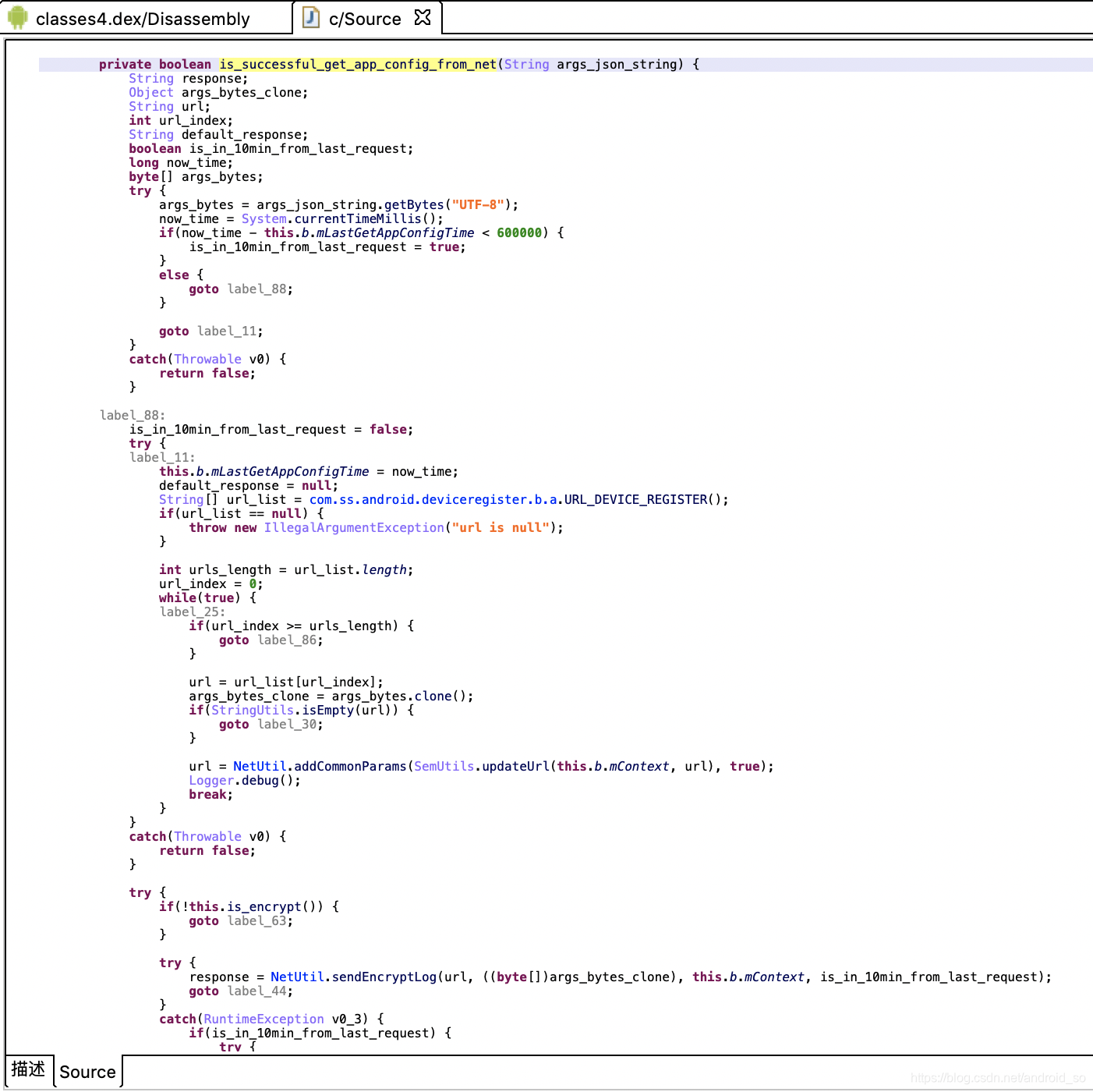 从上图中能够看到,日志中输出了该类所在的dex文件为classes4.dex。那么就用JEB打开classes4.dex吧,然后找到这个类,分析一下上面那个重要的函数,如下图所示: