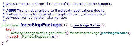 通过一些技术手段,我们发现,大部分软件都是通过调用forceStopPackage(String pacakgeName)函数将某一进程结束掉。这是系统提供的一条API,但是,这一函数的调用有许多限制。想想如果随便一个应用都可以调用他结束其他程序的进程,那Android系统岂不是要大乱。
