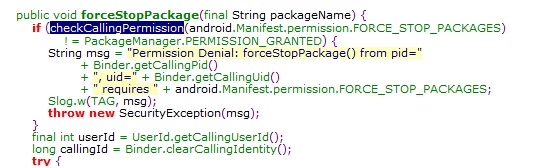 这就是为什么安全软件要获取root权限,因为有了root权限就可以通过这样的检查。有人可能要说这条检查是检查FORCE_STOP_PACKAGE权限,而不是root权限。实则,这条permission没有在SDK中暴露出来,即便注册了这个permission,普通APP也不会被授予这个权限。申请了root权限的APP就具有了最高的权限,在这里不会被过滤掉,畅通无阻。