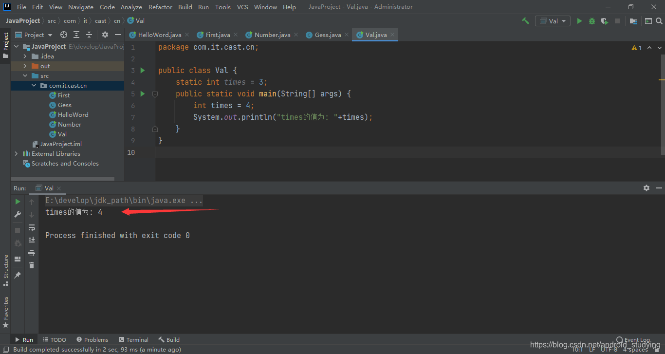 package com.it.cast.cn; public class Val { static int times = 3; public static void main(String[] args) { int times = 4; System.out.println("times的值为: "+times); } }