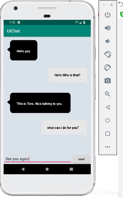 我们在主界面中放置了一个RecyclerView用于显示聊天的消息内容,又放置了一个EditText用于输入消息,还放置了一个Button用于发送消息。