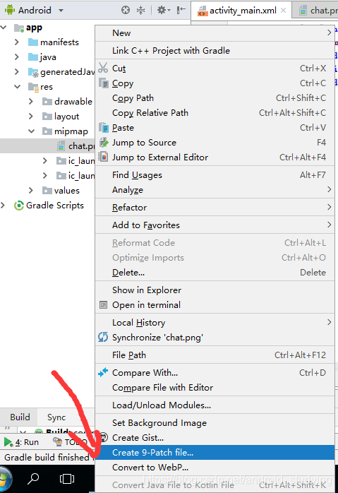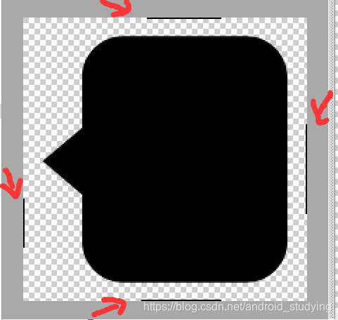 这里我们只需要在资源目录中找到图片,并且右击,选择Create 9-Patch file... 然后下一步,就生成了一个chat.9.png的图片,我们打开它,并且将鼠标移动到灰色边框旁边,分别在4个方向上拖动鼠标,绘制出4个小黑边,小黑边就是允许拉伸的区域,具体步骤请看图解: