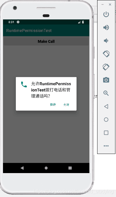 调用玩了requestPermission()方法之后,系统会弹出一个权限申请的对话框,然后用户可以选择同意或拒绝我们的权限申请,不论是那种结果,最终都会回调到onRequestPermissionResult()方法中,而授权的结果则会封装在grantResults参数当中。这里我们只需要判断一下最后的授权结果,如果用户同意的话就调用call()方法来拨打电话,如果用户拒绝的话我们只能放弃操作,并且弹出一条拒绝权限的失败提示。