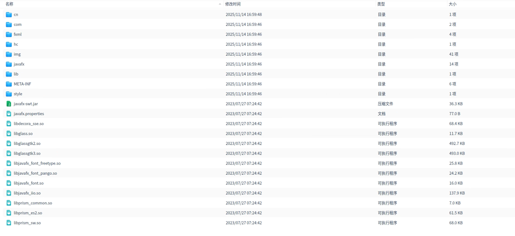 该路径下可看到JavaFx所需要的.so文件,根据需要把jar文件中的.so替换,即可运行。