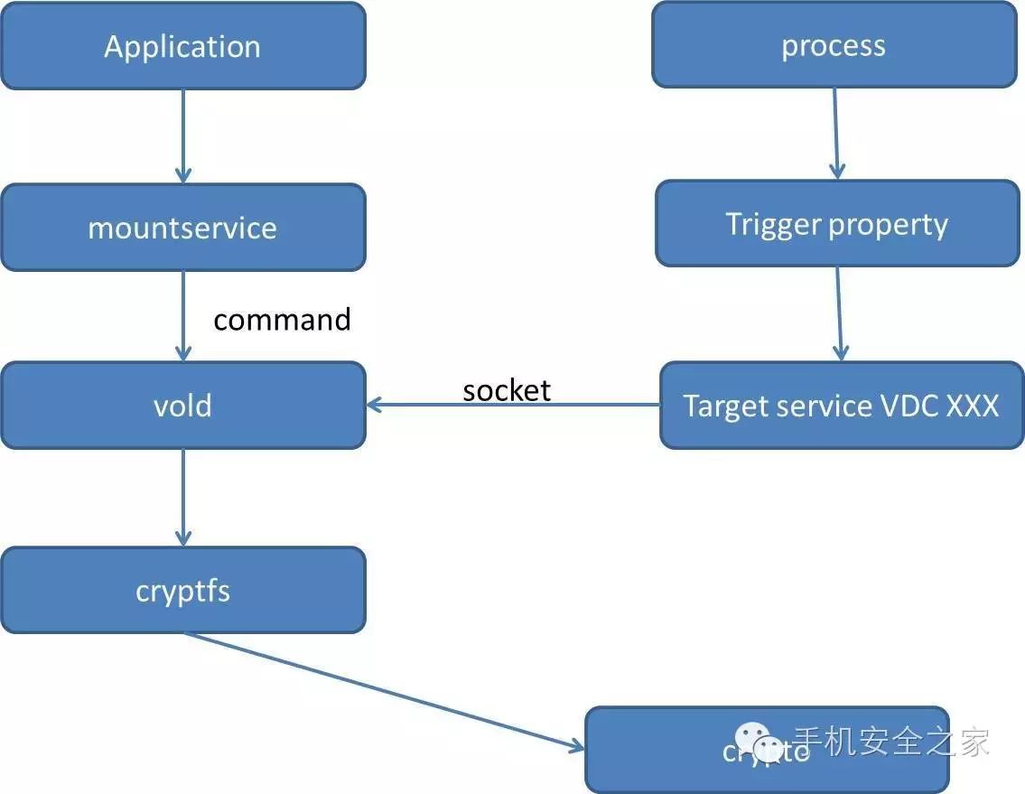 Android中涉及到加解密的模块主要有vold,cryptfs,mountservice.他们主要是通过发command的方式来触发系统进行访问。下面是FDE的架构图。