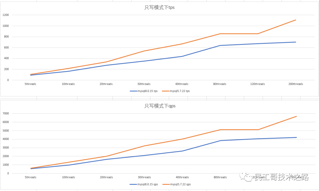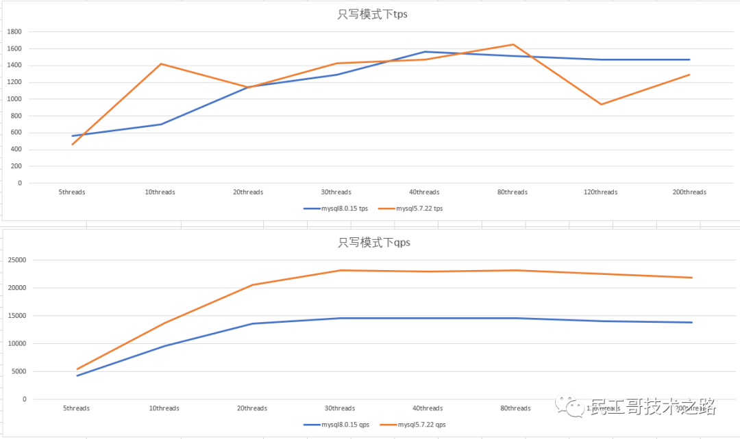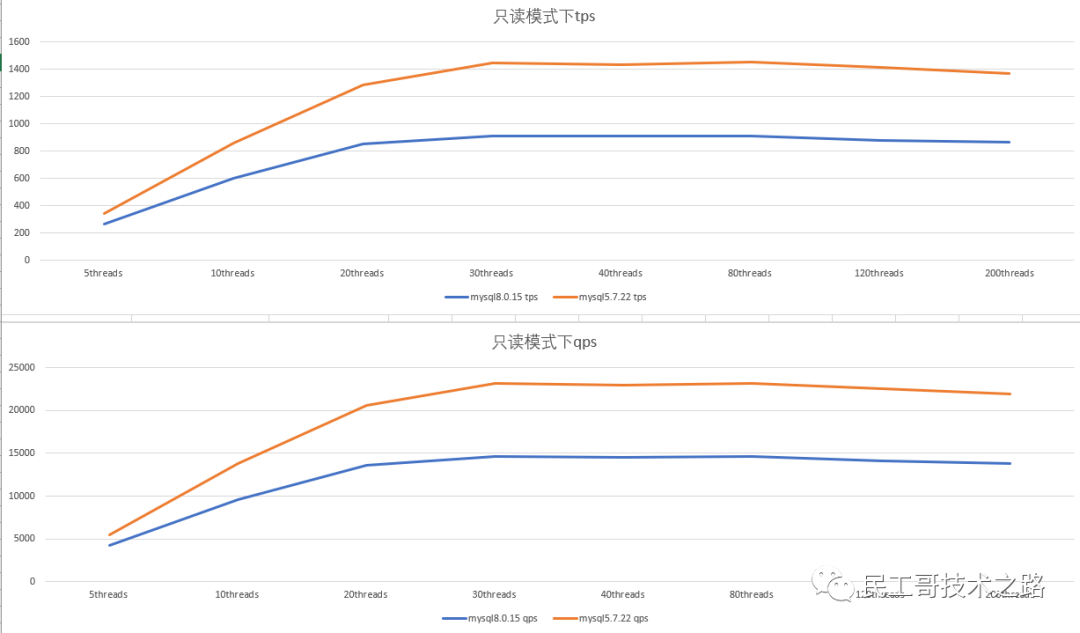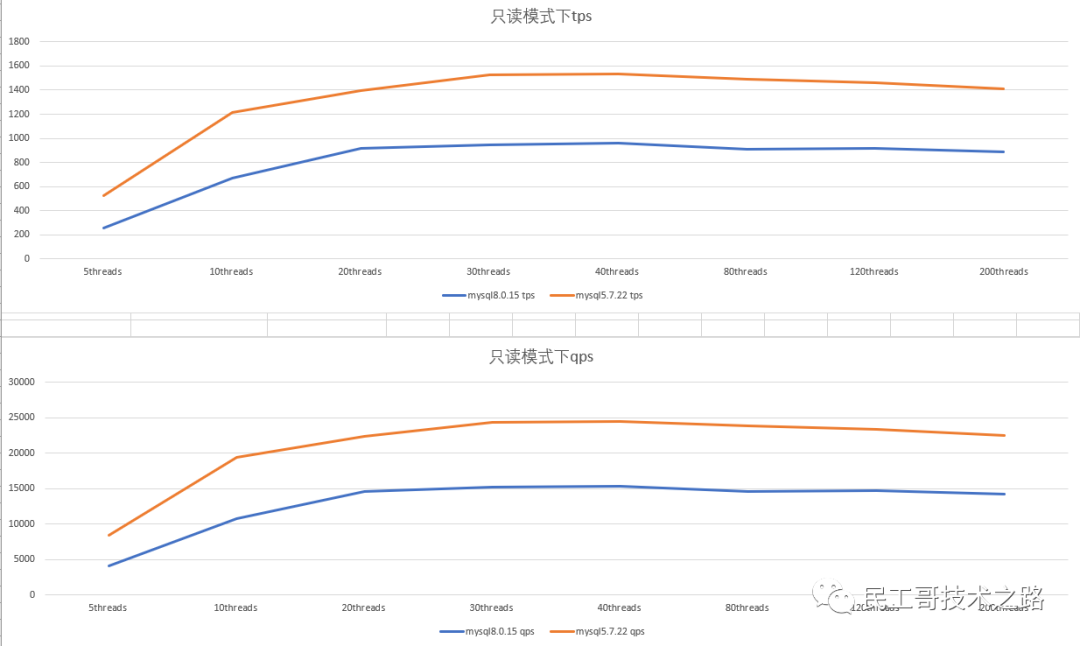 0 2配置,只读模式下,mysql5.7.22性能比mysql8.0.15 好1/3左右;随着并发数的上升,性能也没有上升,反而有下降的趋势.