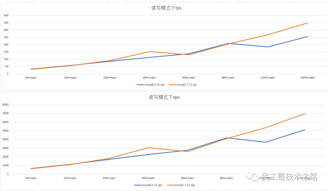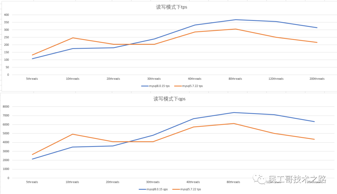 #用于sysbench 测试在读写模式、只读模式、只写模式下 mysql5.7和mysql8.0 的tps,qps