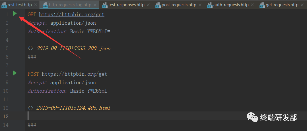 IntelliJ IDEA自动将最近执行的50个请求保存到http-requests-log.http 文件中,该文件存储在项目的.idea / httpRequests / 目录下。使用请求历史记录,您可以快速导航到特定响应并再次发出请求。文件内容大如下图所示,再次发出请求只要点击那个运行按钮即可。如果从请求历史记录再次发出请求,则其执行信息和响应输出的链接将添加到请求历史记录文件的顶部。
