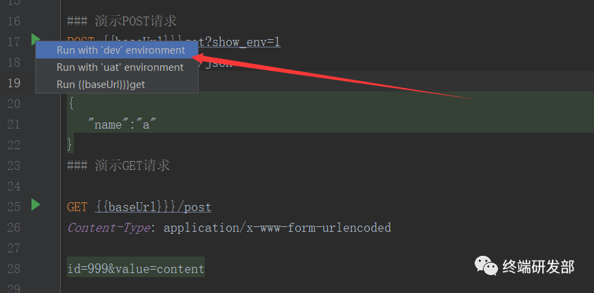 那么在选择执行请求的时候,IDEA就会让你选执行那个环境的配置,如: