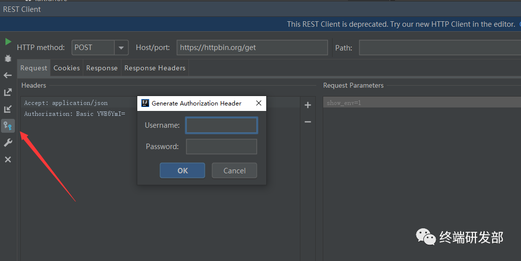 可以看到,这个控制台展示的功能区和postman已经没什么差别了,包括请求方式,请求参数和请求头的填充都已经包含了,特别说明下的是,如果请求的方式是Authorization :Basic这种方式认证的话,可以点击下图所示的按钮,会弹出填充用户名和密码的窗口出来,填完后会自动补充到Authorization 的header里面去