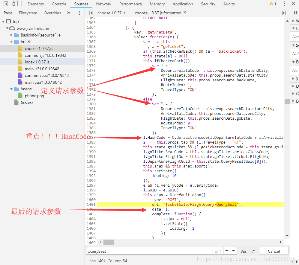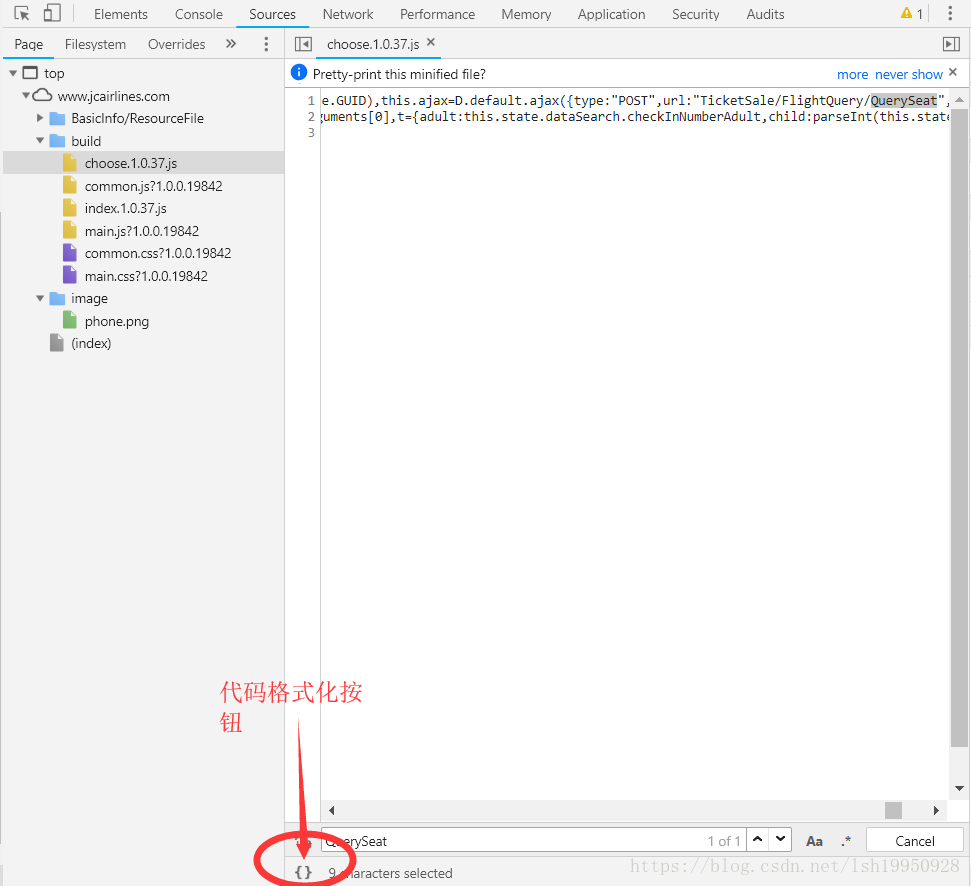 【关键字】"QuerySeat" 一大堆js文件一个一个找吧,运气很好,第一个就是,可以清楚的看到“POST”一词,那这一定就是一个Ajax请求咯,这里有一个技巧,一般情况下,服务器会对静态资源进行压缩,所以需要format才能看个大概