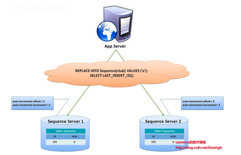 另有一种主键生成策略,类似sequence表方案,更好的解决了单点和性能瓶颈问题。这一方案的整体思想是:建立2个以上的全局ID生成的服务器,每个服务器上只部署一个数据库,每个库有一张sequence表用于记录当前全局ID。