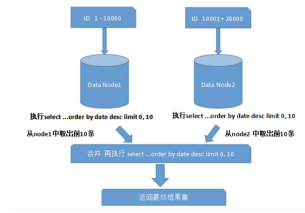 需要先在不同的分片节点中将数据进行排序并返回,然后将不同分片返回的结果集进行汇总和再次排序,最终返回给用户 如下图: