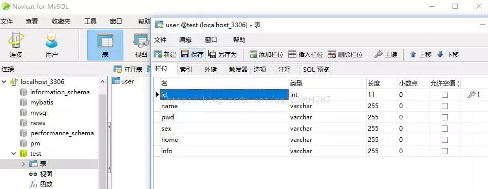 1.首先打开mysql数据库 新建一个数据库test,然后生成对应的表结构