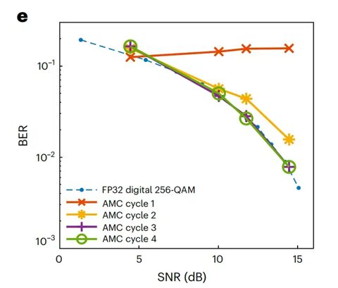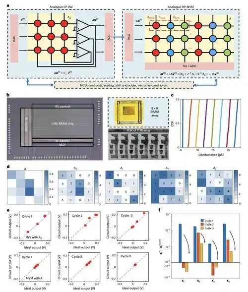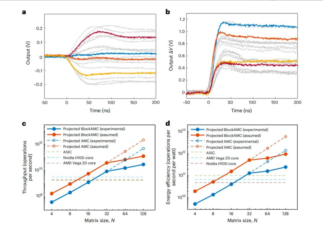 关于实质证据,我看性能对比(图5c/d)确实是推算,不过它是基于实验数据。论文在图5a 和 5b 中用示波器实测了核心模拟运算的瞬态响应时间(求逆约120ns,乘法约60ns)。