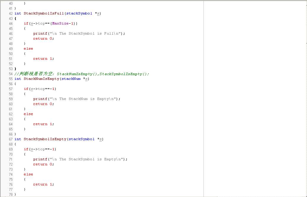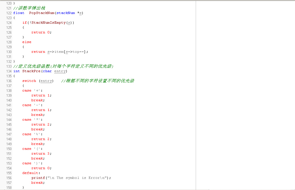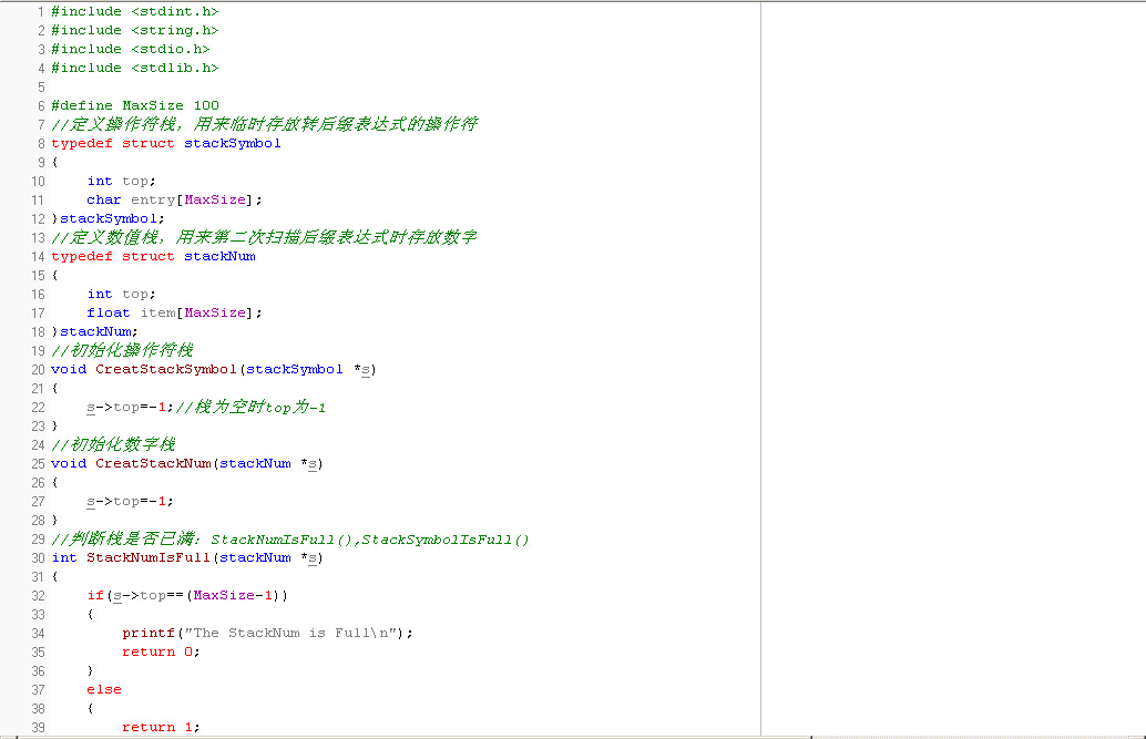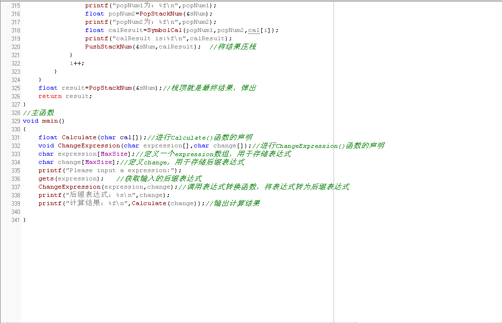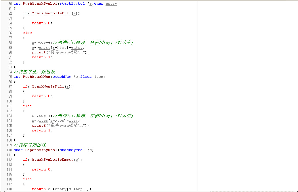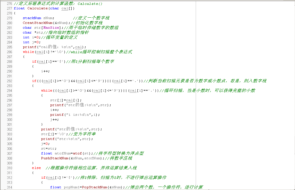2:后缀表达式计算:定义一个数字栈,并将数字栈初始化为空。定义一个临时存放数数字的字符型数组str[],定义一个指向临时数组的指针*str,定义循环变量。利用While循环扫描数组:首先判断当前所扫描元素是否为$符号,若是,则i++;若不是,则判断当前扫描元素是否为数字或小数点,若是,则循环扫描整个数字,以便数字为小数时获得一个完整的小数。将扫描数字赋给str[]数组,然后利用st=str令指针指向临时数组str[],利用atof()函数将字符型转为浮点型,并压入数字栈。若扫描不是数字或小数点,弹出两个数字一个操作符,调用SymbolCal(float popNum1, float popNum2, char popSymbol2)函数进行计算,将计算结果压入数字栈。注意:判断当前元素是否为$符号,若是则不进行弹出计算操作。数字栈栈顶元素即为运算结果 ,弹出返回。