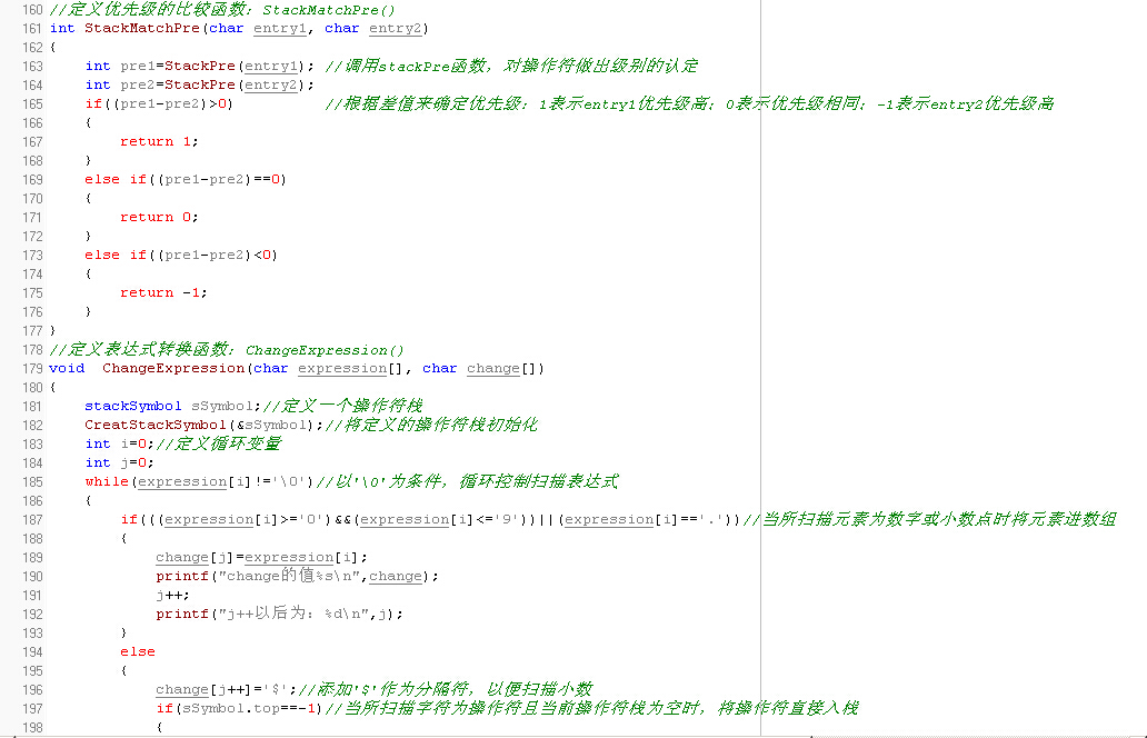 (2):若扫描为操作符:则先判断操作符栈是否为空,若为空,则直接压入操作符栈。若不为空,将change[]数组中加个$符号,用于后面计算时扫描整个数字,然后判断当前所扫描元素是否为右括号,若是右括号,则判断栈顶元素是否为左括号,若是,将左括号弹出操作符栈;若栈顶元素不是左括号,则用While循环将栈顶元素弹出,直到栈顶元素为左括号,然后将左括号弹出操作符栈。若当前所扫描元素不是右括号,则调用操作符优先级比较函数比较当前所扫描元素与栈顶元素的优先级:如果所扫描元素的优先级高于栈顶元素时,将所扫描元素直接入栈;如果当前所扫描元素优先级低于栈顶元素时,判断栈顶元素是否为左括号,若是,当前扫描元素直接入栈,若不是,则栈顶元素出栈进数组,直到所扫描元素高于栈顶元素的优先级为止,然后将当前所扫描元素直接入操作符栈。本次循环结束,i++,进行下一次循环,直到遇见\0,While循环结束。最后判断操作符栈是否为空,若不为空,则将操作符栈中操作符全部弹出,赋给数组。
