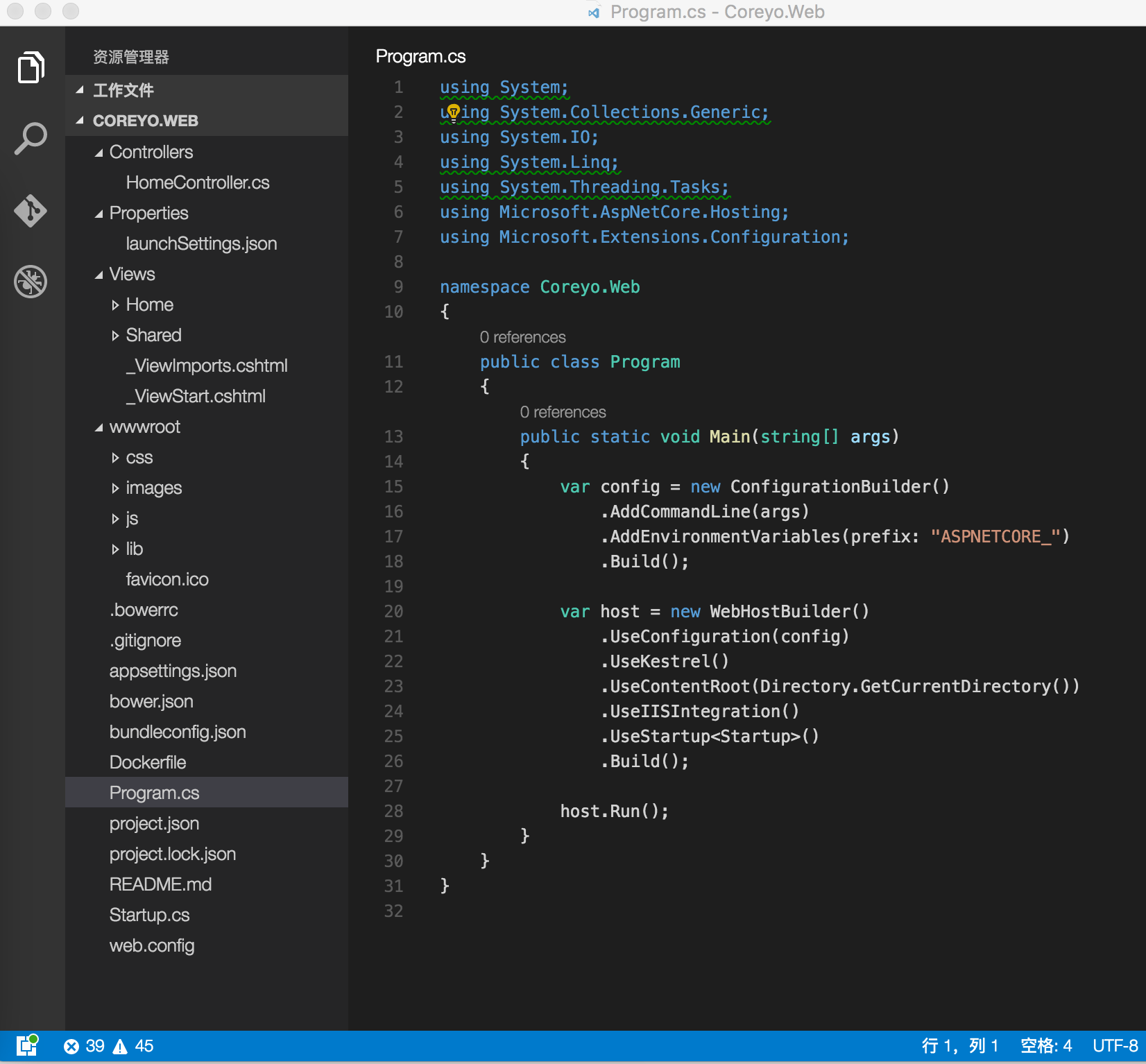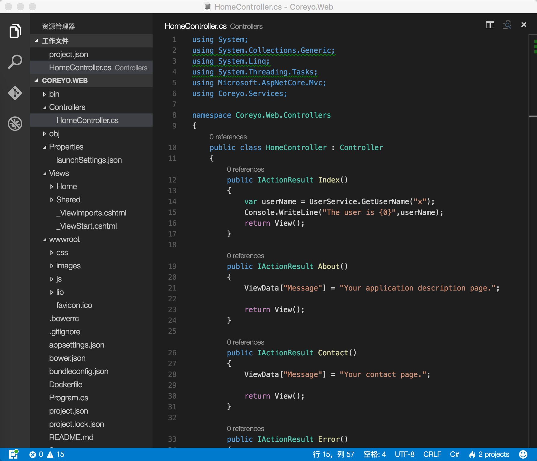 但是现在Coreyo.Services跟Coreyo.Web两个项目是独立,VSCode又没有VS的引用功能,怎么才能让Coreyo.Web来引用Coreyo.Services并调用它的方法呢?