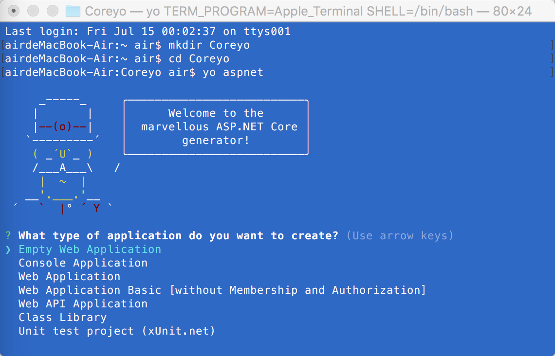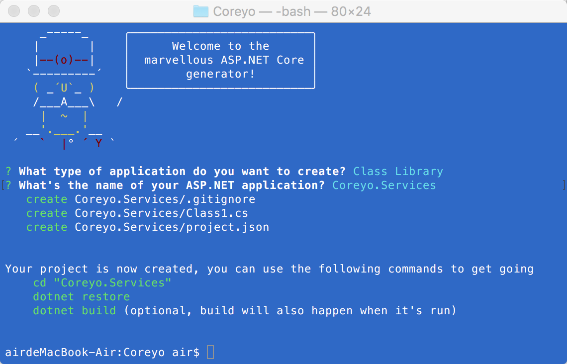 接着让填写项目的名称Coreyo.Web,回车之后yeoman会帮你生成所有的文件,包括默认的Controllers,Views,JavaScript库等,这个跟我们利用ViusalStudio来新建一个项目完成的工作是一样的。