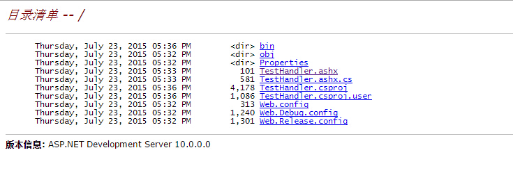 F5运行时,会发现浏览器显示了一个列表,因为ashx不是浏览器认识的可以展示的内容,需要在后面指定运行的一般处理程序名称,或者,直接在列表中选择你要查看运行的ashx.