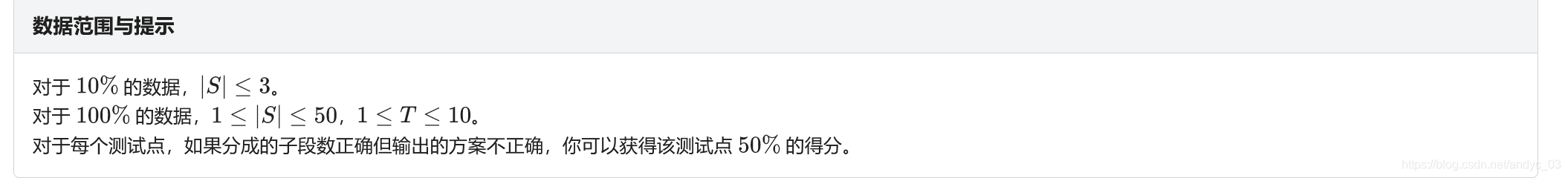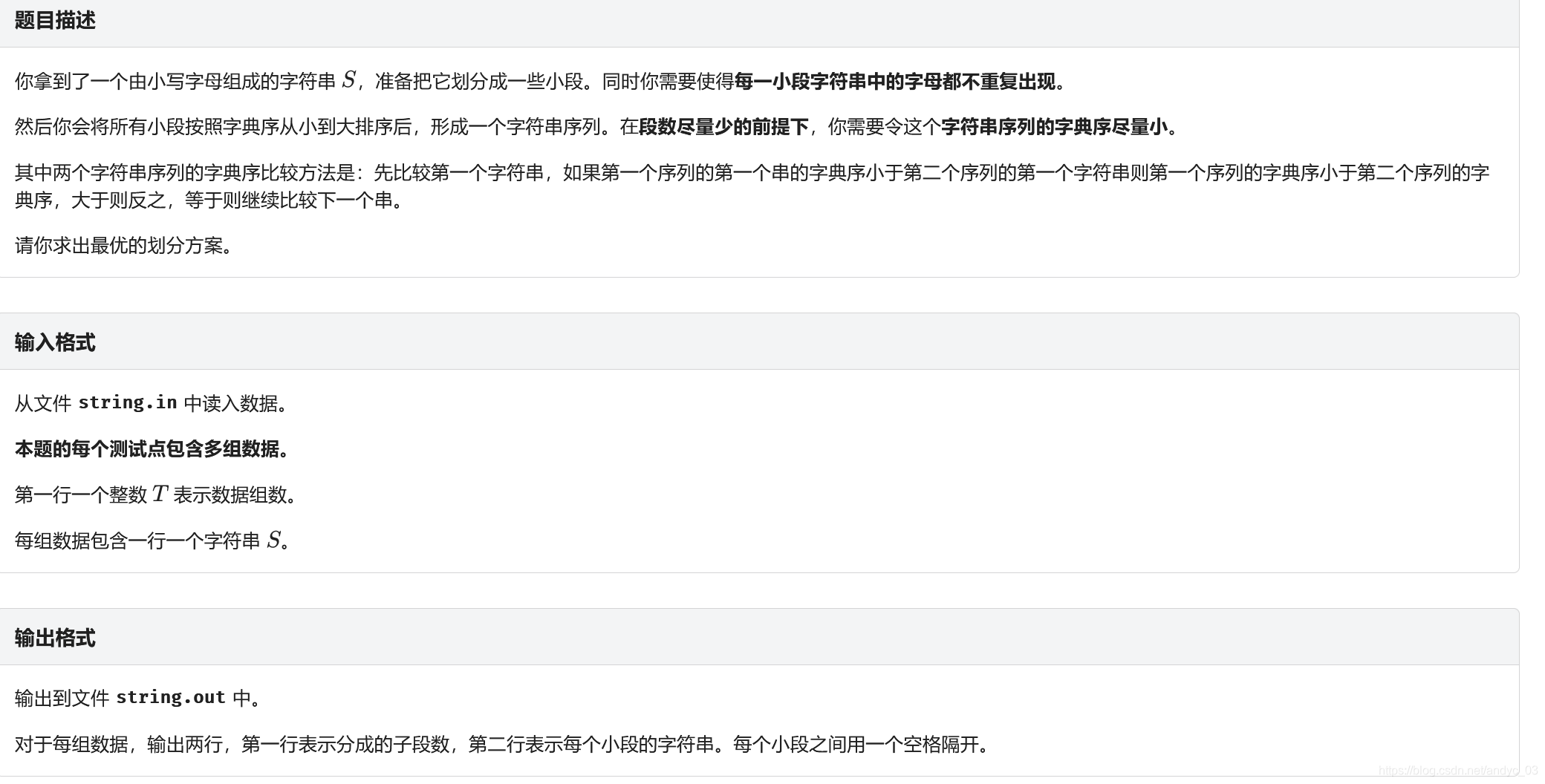 本文介绍了一种使用动态规划(DP)算法解决特定字符串划分问题的方法。通过记录每个状态的最佳方案并进行适当的字符串排序修改,实现了高效求解。代码中详细展示了如何实现这一过程,包括状态定义、转移方程及优化技巧。